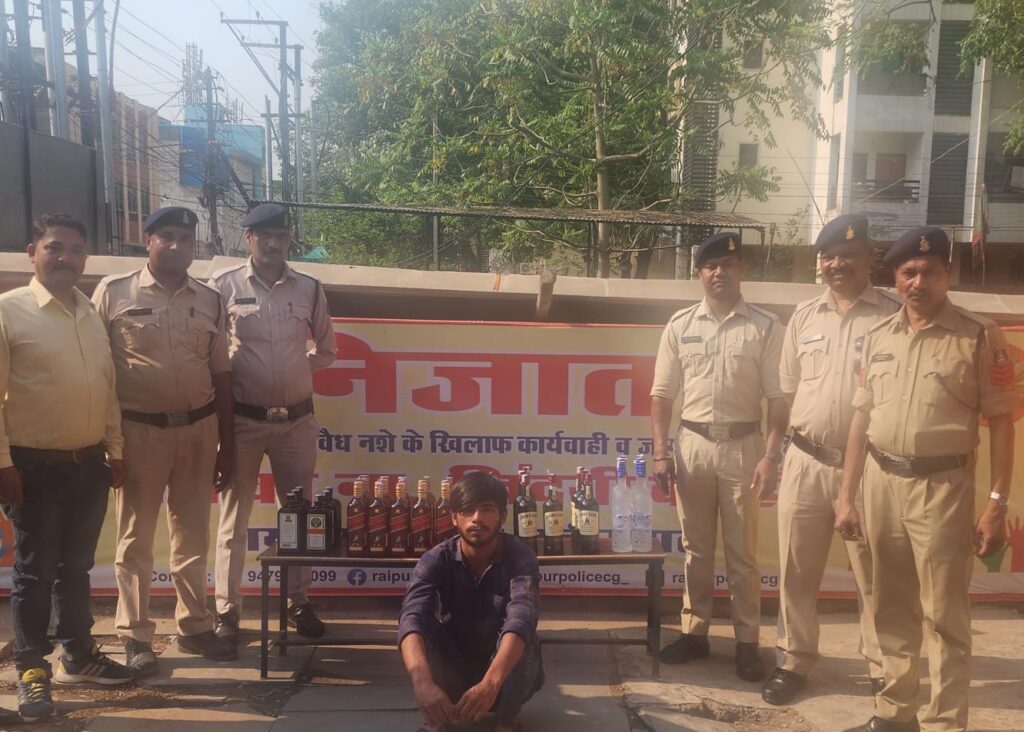 रायपुर – वरिष्ठ पुलिस अधीक्षक महोदय श्री संतोष कुमार सिंह के दिशा निर्देशन पर रायपुर पुलिस द्वारा अवैध नशा के विरुद्ध विशेष अभियान *निजात* चलाया जा रहा है। अतिरिक्त पुलिस अधीक्षक (शहर) श्री लखन पटले के मार्गदर्शन एवं नगर पुलिस अधीक्षक (कोतवाली) श्री योगेश साहू के पर्यवेक्षण में लगातार चेकिंग कार्यवाही की जा रही है। दिनांक 22.04.2024 को थाना मौदहापारा को सूचना प्राप्त हुई कि चारपहिया वाहन सवार एक व्यक्ति अपने वाहन में अवैध रूप से शराब लेकर जयस्तंभ चौक की ओर से आ रहा है। जिस पर अतिरिक्त पुलिस अधीक्षक शहर श्री लखन पटले एवं नगर पुलिस अधीक्षक कोतवाली श्री योगेश साहू द्वारा आरोपी को शराब के साथ रंगे हाथ पकड़ने निर्देशित किया गया। जिस पर थाना प्रभारी मौदहापारा के नेेतृत्व में थाना मौदहापारा पुलिस टीम द्वारा वाहन को पकड़ने हेतु जयस्तंभ चौक में नाकेबंदी पाईंट लगाया गया। इसी दौरान पुलिस टीम के सदस्यों द्वारा वाहन को आता देख रूकवाने का प्रयास करने पर वाहन का चालक वाहन को तेज गति से चलाते हुए के.के.रोड की ओर भागने लगा, कि पुलिस टीम के सदस्यों द्वारा वाहन का पीछा कर दौड़ाकर घेराबंदी कर वाहन को के.के. रोड स्थित कबाडी चौक पास पकड़ा गया। वाहन में एक व्यक्ति सवार था जिसने पूछताछ में अपना नाम ओम प्रथम दुबे निवासी कोटा थाना सरस्वती नगर रायपुर होना बताया गया। टीम के सदस्यों द्वारा उसके वाहन की तलाशी लेने पर वाहन की डिक्की में अंग्रेजी शराब रखा होना पाया गया। शराब परिवहन करने/रखने के संबंध में ओम प्रथम दुबे से वैध दस्तावेज की मांग करने पर उसके द्वारा किसी प्रकार का कोई दस्तावेज प्रस्तुत न कर टीम के सदस्यों को लगातार गुमराह करने का प्रयास किया जा रहा था। जिस पर आरोपी ओमप्रथम दुबे को गिरफ्तार कर उसके कब्जे से अलग-अलग ब्रान्ड के कुल 41 बॉटल अंग्रेजी शराब एवं शराब परिवहन में प्रयुक्त चारपहिया वाहन क्रमांक सी जी/04/एन आर/6239 जुमला कीमती लगभग 6,50,000/- रूपये जप्त कर आरोपी के विरूद्ध थाना मौदहापारा मंे अपराध क्रमांक 148/24 धारा 34(2) आबकारी एक्ट का अपराध पंजीबद्ध कर कार्यवाही किया गया।