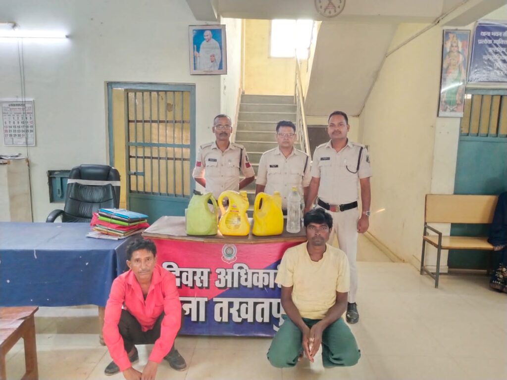 आशीष कश्यप बिलासपुर:-* पुलिस अधीक्षक महोदय बिलासपुर श्री रजनेश सिंह (भा. पु . से.) द्वारा अवैध कार्यों में संलिप्त व्यक्तियों के विरुद्ध *प्रहार अभियान* चलाया जा रहा है। इसके परिपालन में आज दिनांक 10.10.2024 को थाना प्रभारी तखतपुर के नेतृत्व में ग्राम परसाकापा एवं ग्राम चूलघट में अलग-अलग स्थान पर रेड कार्यवाही की गई, कार्यवाही के दौरान आरोपी हरिश्चंद्र केवट के कब्जे से 6 लीटर महुआ शराब एवं आरोपी महेश नट के कब्जे से 7 लीटर महुआ शराब कुल 13 लीटर महुआ शराब जप्त कर आरोपीगण के विरुद्ध धारा 34 (2) आबकारी अधिनियम के अंतर्गत कार्यवाही कर, रिमांड पर भेजा गया है।