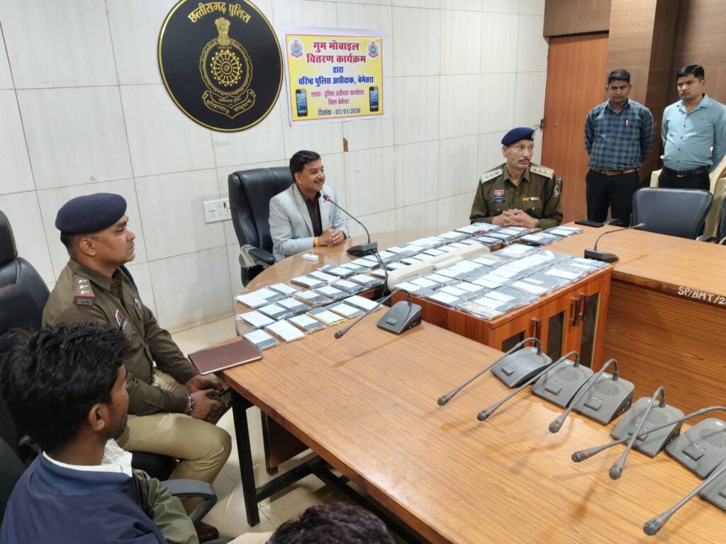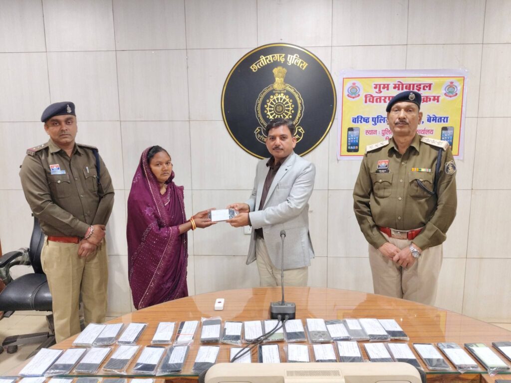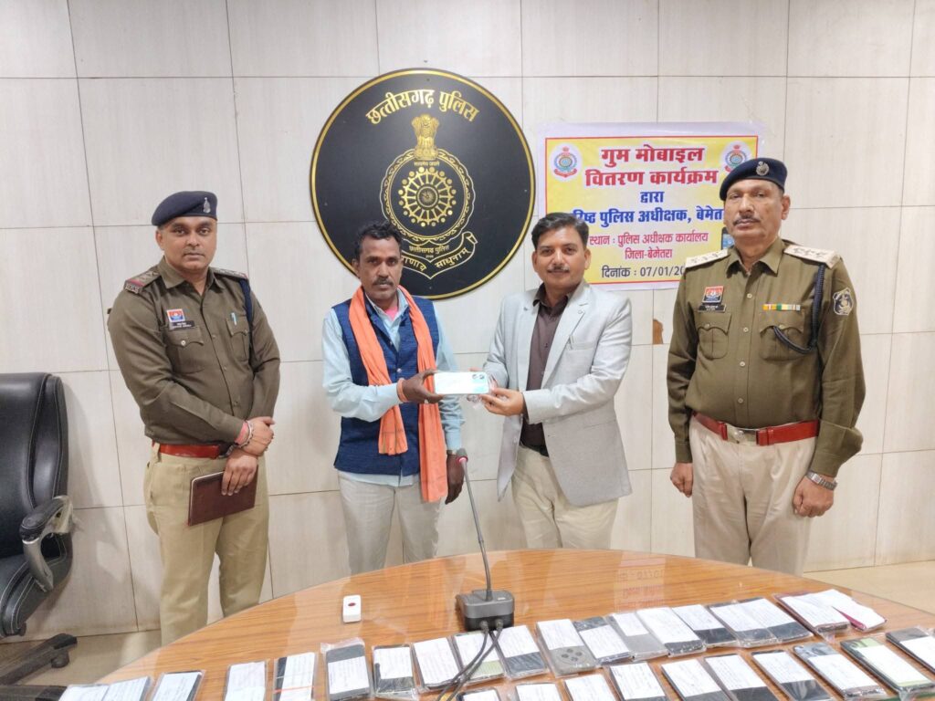 बेमेतरा, जिले के थाना/चौकी क्षेत्रों में गुम हुए मोबाईलों को ‘‘CEIR पोर्टल के माध्यम से अभियान के तहत, पुलिस महानिरीक्षक दुर्ग रेंज, दुर्ग श्री राम गोपाल गर्ग (भा.पु.से.) एवं वरिष्ठ पुलिस अधीक्षक बेमेतरा श्री रामकृष्ण साहू (भा.पु.से.) के निर्देशन एवं साइबर नोडल एवं एसडीओपी बेरला श्री विनय कुमार के मार्गदर्शन में चलाए जा रहे विशेष अभियान के तहत खोए हुए मोबाइलों की पतासाजी एवं बरामदगी हेतु CEIR (Central Equipment Identity Register) पोर्टल पर प्राप्त शिकायतों एवं गुम मोबाईल का विश्लेषण कर कार्रवाई की गई।