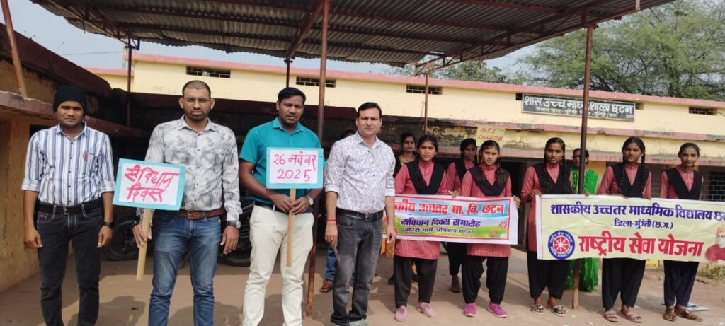 तिजराम साहू ब्यूरो मुंगेली डॉ भीमराव अंबेडकर के प्रतिमा पर माल्यार्पण कर कार्यक्रम का शुभारंभ किया गया मुख्य अतिथि सरपंच लूमेस सप्रे के द्वारा के द्वारा संविधान के प्रस्तावना का वाचन किया गया इस अवसर पर उन्होंने बताया कि 26 नवंबर 1949 को संविधान को अपनाया गया था/ संविधान विश्व के सबसे बड़े लोकतंत्र का संविधान 26 जनवरी 1950 को लागू हुआ था/संविधान निर्माण में राज्य के कई कानून विद्वानों ने भी अपना योगदान दिया था जिसमें पंडित रविशंकर शुक्ल घनश्याम सिंह गुप्त, बैरिस्टर ठाकुर छेदीलाललाल संविधान सभा के सदस्य थे/भारत का संविधान दुनिया का सबसे बड़ा संविधान है संविधान के अनुच्छेद 21ए के तहत सभी को 6 से 14 वर्ष की बालकों को अनिवार्य शिक्षा का मौलिक अधिकार प्राप्त है इस अवसर पर पोस्टर प्रतियोगिता का आयोजन किया गया जिसमें कुमारी नंदिनी प्रथम पुष्कर साहू दूसरेस्थान पर रहे/निबंध प्रतियोगिता में प्रमिला मरकाम प्रथम प्रीति साहू दूसरे स्थान पर रही इस अवसर पर राष्ट्रीय सेवा योजना के छात्र-छात्राओं द्वारा ग्राम भ्रमण किया गया/किस अवसर पर पर उप प्राचार्य उमाकांत मिरी,अशोक सियारे,लालाराम घृत लहरे,अमीन सोनवानी ,रविंद्र गुप्ता, ज्योति सिंह, सुषमा गुप्ता, भाऊराम साहू, शकुंतला साहू राजकुमारी बंजारे, जेठू राम साहू संतोष सप्रे, मीरकंठ साहू उपस्थित रहे