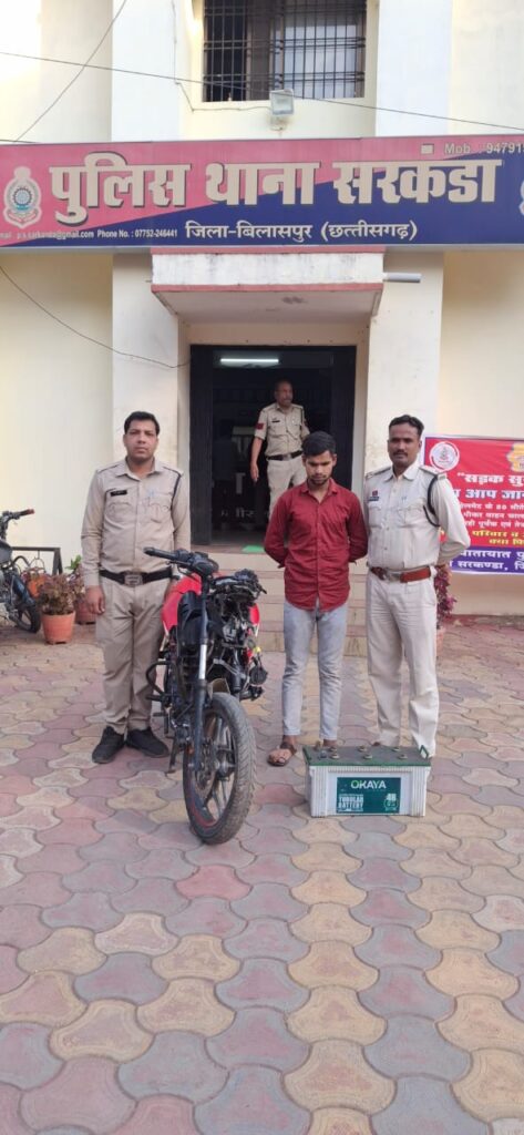 आशीष कश्यप बिलासपुर :-मामले का संक्षिप्त विवरण इस प्रकार है कि दिनांक 22.01.2025 को प्रार्थी लक्ष्मी प्रसाद यादव पिता झड़ीराम यादव उम्र 39 वर्ष निवासी भाठापारा खमतराई का रिपोर्ट दर्ज कराया कि ई रिक्शा का बैट्री को कोई अज्ञात चोर चोरी कर ले गया है, प्रार्थी के उक्त रिपोर्ट पर अपराध सदर पंजीबद्ध कर विवेचना में लिया जाकर आरोपी की पतासाजी की जा रही थी, दिनांक 19.02.2025 को प्रार्थी राज कुमार यादव, शब्बीर अली, टिकाराम सूर्यवंशी, भूपेन्द्र पटेल सभी ने पृथक-पृथक थाना उपस्थित होकर रिपोर्ट दर्ज कराये कि इनके ई रिक्शा आटो में लगे बैट्रो को कोई अज्ञात चोर चोरी कर लिये हैं, जिस पर क्रमशः अप.क्र. 275/2025, 276/25, 277/25, 278/25 दर्ज कर लगातार हो रही ई रिक्शा के बैट्री चोरी पर अंकूश लगाने तत्काल टीम लगाकर आसपास लगे सीसीटीव्ही कैमरों का फूटेज का अवलोकन पर संदेही सुनील कुमार साहू निवासी चिंगराजपारा सरकण्डा के रूप में पहचान हुआ जिसके संबंध में पुलिस अधीक्षक महोदय बिलासपुर श्री रजनेश सिंह (भा.पु.से) को अवगत कराया गया जिनके द्वारा तत्काल वैधानिक कार्यवाही करने निर्देशित किये। जिसके परिपालन में अति0 पुलिस अधीक्षक बिलासपुर श्री उदयन बेहार एवं नगर पुलिस अधीक्षक सरकंडा श्री सिद्धार्थ बघेल के मार्गदर्शन में थाना प्रभारी निरीक्षक निलेश पाण्डेय के निर्देशन में तत्काल टीम द्वारा संदेही सुनील साहू को उसके सकुनत पर पकड़ कर ई रिक्शा, बैटरी चार्जर के संबंध मंे पूछताछ करने पर अपने साथी ओम प्रकाश खाण्डे उर्फ दादू, शिवा राजपूत एवं प्रदीप के साथ मिलकर अलग-अलग घटना कारित करना एवं छिपा कर रखना बताते हुये चोरी किये मशरूका बरामद कराया जिससे ओम प्रकाश खाण्डे को हिरासत में लेकर पूछताछ करने पर जूर्म स्वीकार किया जिससे उक्त प्रकरणें में चोरी गई मशरूका जप्त कर आरोपी 01. सुनील साहू पिता भरत लाल साहू उम्र 20 वर्ष निवासी विश्वकर्मा चौक चिंगराजपारा, थाना सरकण्डा जिला बिलासपुर (छ.ग.) 02. ओम प्रकाश खाण्डे उर्फ दादू पिता राज कुमार खाण्डे उम्र 21 वर्ष निवासी लक्ष्मी चौक चिंगराजपारा, थाना सरकण्डा जिला बिलासपुर (छ.ग.) को विधिवत् गिरफ्तार कर दिनांक 20.02.2025 को न्यायिक रिमाण्ड पर न्यायालय पेश किया गया है। प्रकरण के अन्य आरोपी शिवा राजपूत थाना कोनी के आबकारी एक्ट के प्रकरण मंे जेल मे निरूद्ध है। आरोपी प्रदीप घटना बाद से फरार चल रहा था जिसका पता तलाश किया जा रहा था कि आज दिनांक 22.02.2025 को मुखबीर से सूचना मिला कि आरोपी सकुनत पर है, उक्त सूचना पर वरिष्ठ अधिकारियों को अवगत कराकर आरोपी प्रदीप दिनकर की पतासाजी हेतु टीम भेजा गया जिनके द्वारा आरोपी के सकुनत पर घेराबंदी कर पकड़ा गया जिससे पूछताछ करने पर अपने साथी सुनील साहू एवं ओम प्रकाश खाण्डे के साथ मिलकर घटना कारित करना 