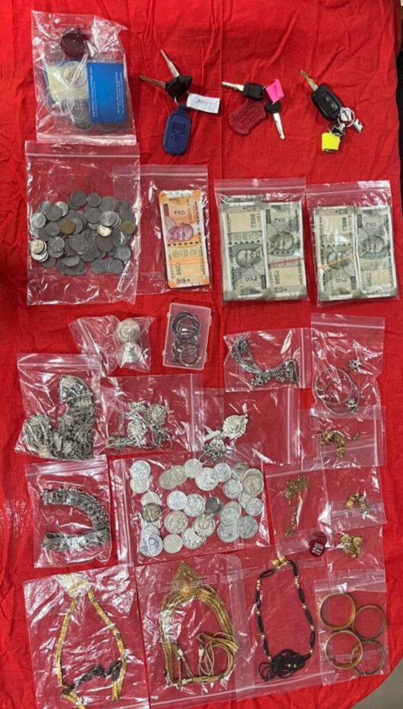 02. आरोपियों से चांदी का सामान-एक नग चांदी का करधन, एक जोड़ी चांदी का पायल, एक जोड़ी चांदी का हाथ पोस, एक जोड़ी चांदी का छोटा पायल, एक नग चांदी का काजल दान, एक जोड़ी चांदी का सिदूर डिब्बी, एक नग चाबी छल्ला, दो जोडी चांदी का बड़ा बिछिया, एक जोड़ी कंगन, 30 नग चांदी सिक्का जिसमें गणेश और लक्ष्मी का चित्र बना हुआ है।