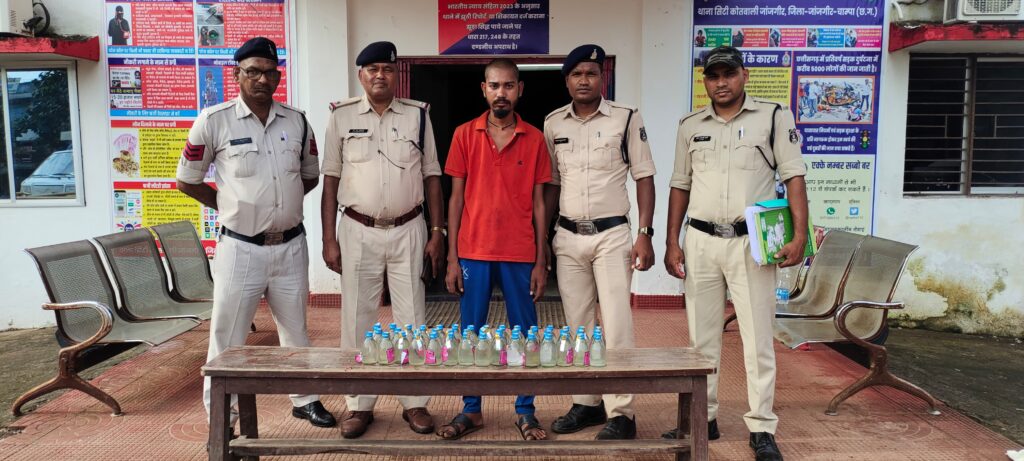 जांजगीर:– विवेक शुक्ला (IPS) पुलिस अधीक्षक जांजगीर चांपा के निर्देशन में जिला पुलिस जांजगीर द्वारा अवैध शराब बिक्री करने वालो के विरूद्ध लगातार कार्यवाही की जा रही है इसी क्रम मे थाना जांजगीर पुलिस द्वारा आरोपी कन्हैया यादव पिता लक्ष्मण यादव उम्र 30 साल निवासी वार्ड न 15 बाजार पारा जांजगीर के कब्जे से 47 पाव देशी प्लेन शराब कीमती 4230 रुपये को गवाहों के समक्ष बरामद किया जाकर आरोपी के विरूद्ध थाना जांजगीर में अपराध धारा 34 (2) आबकारी अधिनियम के तहत पंजीबद्ध किया जाकर आरोपी को विधिवत् गिरफ्तार कर दिनांक 26.08.2024 को न्यायिक रिमाण्ड पर भेजा गया है इसी प्रकार थाना चांपा पुलिस द्वारा आरोपीया रामकुमारी छिपिया उम्र 40 साल निवासी अर्चनलाला चौक भोजपुर थाना चांपा जिला जांजगीर चांपा के कब्जे से 10 पाव देशी प्लेन शराब एवं 10 लीटर कच्ची महुआ शराब किमती 4250 रू को गवाहों के समक्ष बरामद किया जाकर आरोपि के विरूद्ध थाना चांपा में अपराध धारा 34 (2) आबकारी अधिनियम के तहत पंजीबद्ध किया जाकर आरोपी को विधिवत् गिरफ्तार कर न्यायिक रिमाण्ड पर जेल भेजा गया।