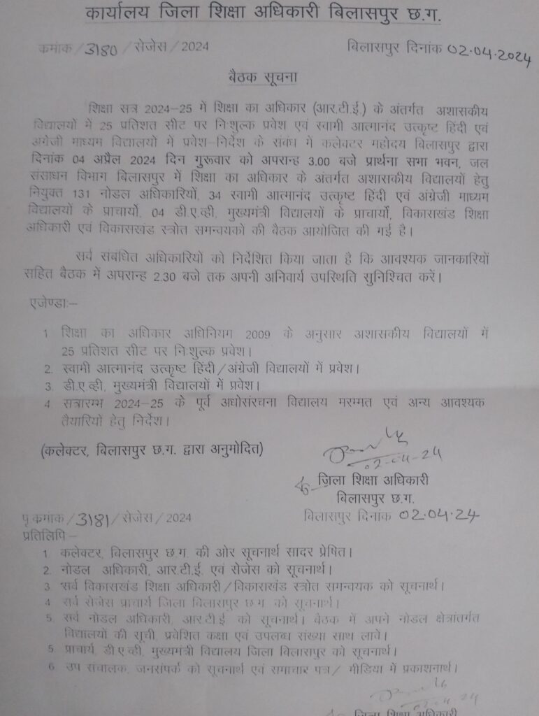 बैठक में शिक्षा का अधिकार अधिनियम 2009 के अनुसार अशासकीय विद्यालयों में 25 प्रतिशत सीट पर निशुल्क प्रवेश, स्वामी आत्मानंद उत्कृष्ट हिंदी एवं अंग्रेजी विद्यालयों में प्रवेश, डी.ए.व्ही, मुख्यमंत्री विद्यालयों में प्रवेश, 2024-25 सत्र आरंभ के पूर्व अधोसंरचना विद्यालय मरम्मत एवं अन्य तैयारियों के संबंध में चर्चा की जाएगी।