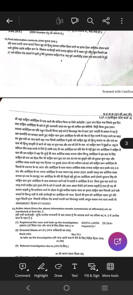 ब्यूरो रायपुर/कवर्धा:– छत्तीसगढ़ के कवर्धा जिले में फिर एक बार लव जिहाद का मामला सामने आया है जहां आरोपी खुद को हिंदू बताकर लड़कियों से दोस्ती करता था और फिर जादू- टोना सिखाने के नाम पर दुष्कर्म करता था इतना ही नहीं आरोपी ने पीड़िता के पति को जेल से छुड़ाने के नाम पर 3 लाख रुपये की ठगी भी की वही आरोपी का नाम साहिल खान बताया जा रहा है जानकारी के अनुसार आरोपी युवक ने अपना नाम बदलकर राजू सिंग के नाम पर फर्जी आधार कार्ड बनवा रखा था वही पुलिस ने आरोपी के खिलाफ लव जिहाद बलात्कार समेत कई अन्य धाराओं में केस दर्ज कर लिया है बता दे कि पीड़िता ने सिटी कोतवाली थाने में जाकर रिपोर्ट दर्ज कराई है कि आरोपी युवक से पीड़िता की 6 माह पूर्व चाय की टपरी पर मुलाकात हुई थी जहां आरोपी साहिल खान ने उससे बात करने की कोशिश की थी लेकिन पीड़िता ने उसे भगा दिया जिसके बाद आरोपी ने उसकी जानकारी जुटाई और घर पहुँच गया वही पीड़िता का पति 307 के मामले में जेल में बंद है जहां आरोपी ने फायदा उठाते हुए हिंदू रीति- रिवाज से तंत्र- मंत्र करवाने की सलाह दी जिस पर पीड़िता ने हामी भर दी वही आरोपी ने फिर जज को पैसे देने के नाम पर 6 महीने में 3 लाख रुपये भी ठग लिये वही पीड़िता ने मीडिया को बताया कि कुछ दिन बाद आरोपी साहिल खान उसके घर आया और तंत्र मंत्र के नाम पर शारीरिक संबंध बनाने को कहा जिस पर पीड़िता ने माना कर दिया जिसके कुछ दिन बाद फिर आया और दबाव बनाने लगा कि मै उसे छुड़वा लूंगा और फिर 5 बार उसने पीड़िता के साथ शारीरिक संबंध बनाया परंतु पीड़िता के पति की रिहाई नही होने पर पीड़िता ने सीटी कोतवाली थाना पहुँचकर आरोपी युवक के खिलाफ रिपोर्ट दर्ज कराई है वही पीड़िता ने पुलिस से न्याय की गुहार लगाते हुए आरोपी युवक के खिलाफ कड़ी कार्यवाही करने की मांग की है।