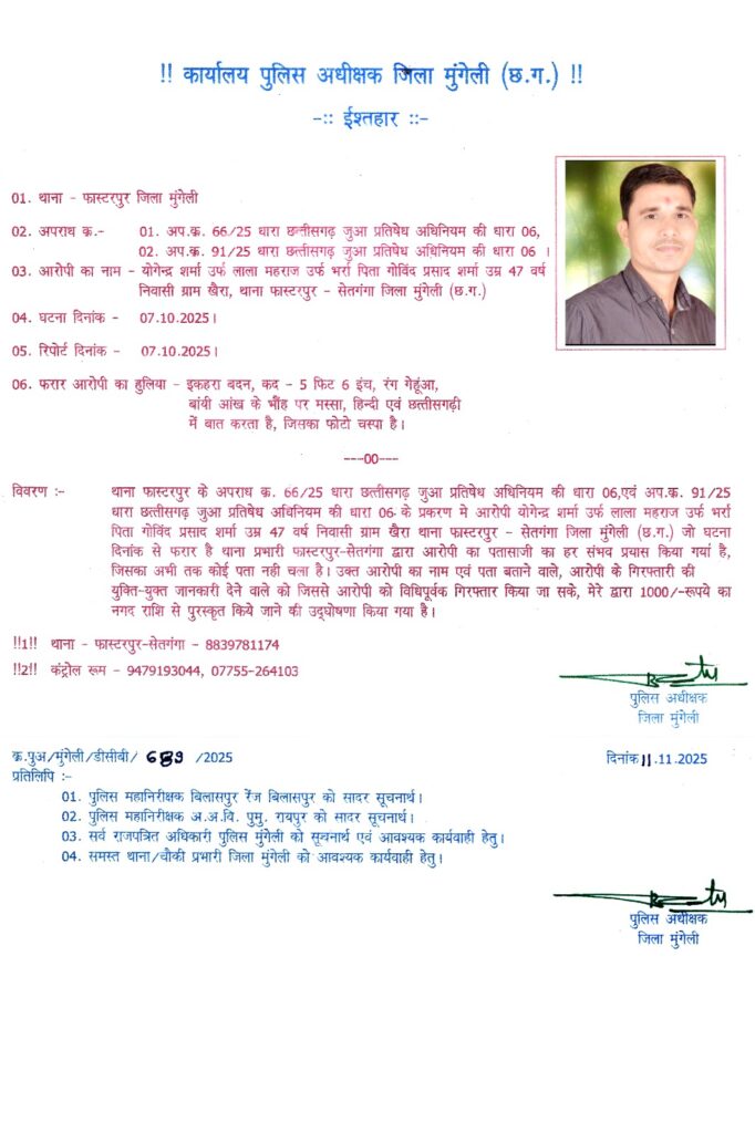 थाना फास्टरपुर के अपराध क्रमांक 66/25 धारा छत्तीसगढ़ जुआ प्रतिषेध अधिनियम की धारा 06, एवं अपराध क्रमांक 91/25 धारा छत्तीसगढ़ जुआ प्रतिषेध अधिनियम की धारा 06 प्रकरण के सट्टा खाईवाल आरोपी योगेन्द्र शर्मा उर्फ लाला महराज उर्फ भर्रा पिता गोविंद प्रसाद शर्मा उम्र 47 वर्ष निवासी ग्राम खैरा थाना फास्टरपुर सेतगंगा जिला मुंगेली (छ.ग.) जो घटना दिनांक 07.10.2025 से ही फरार है। थाना प्रभारी फास्टरपुर -सेतगंगा द्वारा आरोपी का पतासाजी का हर संभव प्रयास किया गया है, जिसका अभी तक कोई पता नही चला है। उक्त आरोपी का नाम एवं पता बताने वाले, आरोपी के गिरफ्तारी की युक्ति-युक्त जानकारी देने वाले को जिससे आरोपी को विधिपूर्वक गिरफ्तार किया जा सके, मुंगेली पुलिस अधीक्षक द्वारा *1000/-रूपये (एक हजार रूपये) नगद राशि* से पुरस्कृत किये जाने की उद्घोषणा किया गया है।