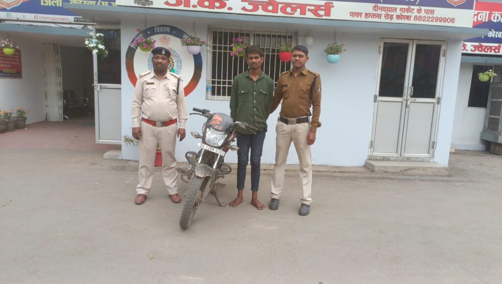 कोरबा – प्रार्थी मोहम्मद अफरोज खान पिता सरफुद्दीन उमर 18 वर्ष निवासी कुचैना थाना कुसमुंडा जिला कोरबा की रिपोर्ट पर अपराध पंजीकृत कर चोरी गए मोटरसाइकिल एवं अज्ञात आरोपी के पतासाजी की जा रही थी आज दिनांक 02/03/2024 को दौरान टाउन भ्रमण के मूकबीर सूचना मिली कि एक व्यक्ति प्लैटिना वाहन मोटरसाइकिल बिना नंबर का बिक्री करने के लिए सीतामढ़ी के आसपास घूम रहा है की सूचना तस्दीक हेतु मौके पर जाकर बताए गए हुलिया अनुसार व्यक्ति को घेराबंदी कर पकड़ा गया जो पूछताछ करने पर अपना नाम उमेश्वर उर्फ उदित साहू पिता पुनाराम साहू उम्र 19 वर्ष निवासी गोकुलगंज सीतामढ़ी कोरबा का रहने वाला बताया जिसे बारीकी से पूछताछ करने पर मोटरसाइकिल को कंधारी ट्रांसपोर्ट ऑफिस राताखार जोड़ा पुल के सामने से चोरी करना कबूल किया कि आरोपी एवं वाहन को कब्जा पुलिस लाकर आरोपी को गिरफ्तार कर वाहन को जप्त कर आरोपी को कोरबा न्यायालय में पेश किया गया है।