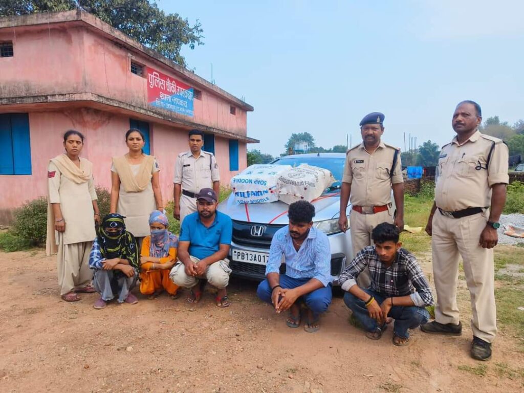 जशपुर:-चौकी उपरकछार और थाना तपकरा की पुलिस टीम द्वारा ओडिशा की ओर से आते संदिग्ध चारपहिये को रोककर तलाशी की गई। तलाशी में वाहन से 26 किलो गांजा (मूल्य 3 लाख रुपये) जब्त कर वाहन सवार 2 महिला सहित 5 आरोपियों को गिरफ्तार किया गया। पांचों आरोपी पंजाब के निवासी हैं। पुलिस द्वारा तस्करी में प्रयुक्त वाहन भी जब्त किया गया।