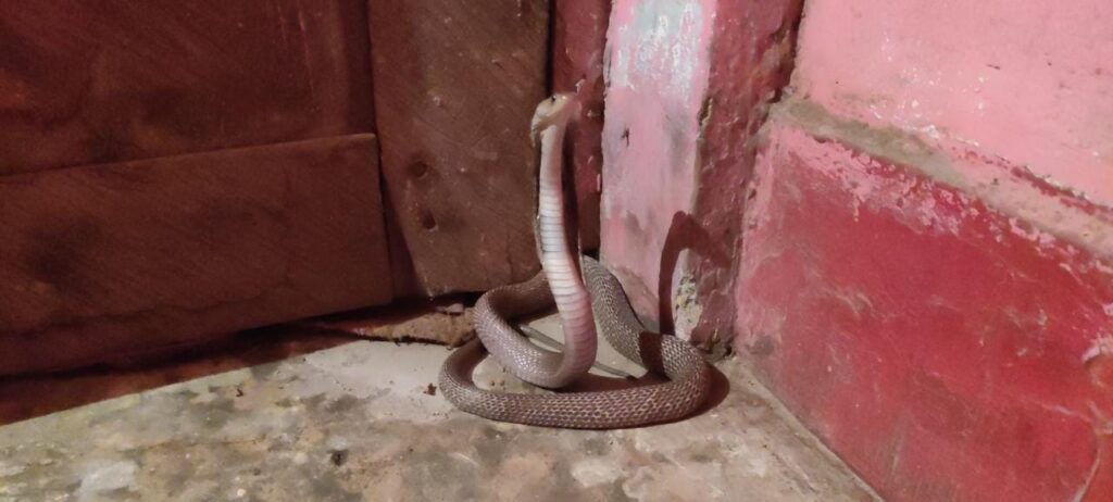 कोरबा – छत्तीसगढ़ में अचानक से मौसम बदलने से पूरा माहौल बदल गया हैं जहां इस वक्त तपती धूप हुआ करती हैं वहीं अचानक बारिश होने से कोहरे के साथ ठंड लगने लगी हैं वहीं इसका असर कोरबा जिले में भी काफी असर देखने को मिल रहा जिले में आसनक से बीती रात में झमा झम बारिश होने से लोगों की मुसिबत बढ़ गई बारिश के कुछ देर बाद ही एक परिवार कई घंटो तक बंधक बन कर एक कमरे में बैठा रहा जी हा मामला हैं कोरबा के दादर खुर्द का जहां ज़मीन में रेंगने वाली मौत कोबरा सांप अचानक से एक छोटे से कमरे में घूस गया वहीं परिवार की महिला खाना बनाने की तैयारी कर रही थीं जब अचानक से कोबरा पर नज़र पड़ी तो परिवार की जान अटक गई और डरे सहमे पूरा परिवार भाग कर एक किनारे बने पठार पर बैठ गया और सांप से जाने की प्रार्थना करने लगें पर वह कोबरा चौखट पर ही फन फैलाए बैठ गया मानो परिवार वालों को बंधक बना लिया हो, किसी तरह मदद के लिए बगल वालों को इसकी जानकारी दी जिसके पश्चात पड़ोसी हर्षल पटेल ने इसकी जानकारी स्नेक रेस्क्यू टीम प्रमुख वन विभाग सदस्य जितेन्द्र सारथी को दिया और बताया साप एक किराने बैठ गया हैं और परिवार वाले अन्दर फस चुके हैं, जितेंद्र सारथी ने हल्की हल्की बारिश होने की वजह से थोड़ी देर में पहुंचने की बात कहीं आखिरकार एक घण्टे के पश्चात जितेन्द्र सारथी मौके पर पहुंचे और कमरे में प्रवेश किया जिसको देख बंधक बनी महिला फूट फूट कर रोने लगीं और बचा लेने की गुहार लगाने लगी फ़िर सारथी ने उनको समझाया तब जाकर उनका डर कम हुआ जिस वक्त कमरे में रेस्क्यू ऑपरेशन चल रहा था वही बाहर लोगों की भीड़ इकट्ठा हो गई थीं।