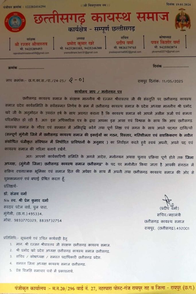 तिजराम साहू ब्यूरो मुंगेली:- छत्तीसगढ़ कायस्थ समाज के संरक्षक श्री रज्जन श्रीवास्तव जी की संस्तुति पर कायस्थ समाज के प्रदेश अध्यक्ष श्री प्रमोद खरे जी के अनुमोदन से डॉ.संजय वर्मा को कायस्थ समाज मुंगेली का जिलाध्यक्ष पद पर मनोनीत किया गया अपनी इस नियुक्ति पर उन्होंने समाज प्रमुखों, प्रदेश प्रतिनिधियों व समाज के समस्त पदाधिकारियों का आभार व्यक्त किया सांथ ही जो जिम्मेदारी समाज ने उनपर दी है उसका पूरी ऊर्जा व तन्मयता से समाज में सभी को सांथ लेकर कार्य करने की बात कही नियुक्ति की खबर मिलते ही समाज के लोगों, शुभचिंतकों व इष्ट मित्रों ने उनको बधाई दिया।