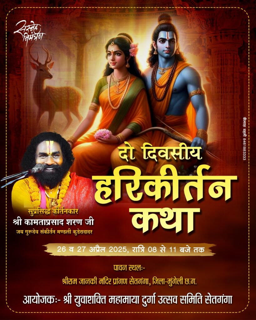 तिजराम साहू ब्यूरो मुंगेली — मुंगेली विकासखंड के सेतगंगा स्थित श्री राम जानकी मंदिर प्रांगण में 26 एवं 27 अप्रैल की रात्रि 08 बजे से संगीत में हरि कीर्तन कथा का आयोजन किया जा रहा है। जिसमे कथा वाचक कामता प्रसाद शरण जी महाराज व जयगुरु संकीर्तन परिवार गरियाबंद द्वारा किया जाएगा। जिसमें मुख्य अतिथि के रूप में छत्तीसगढ़ शासन के उपमुख्यमंत्री विजय शर्मा शामिल होंगे। इसी तरह मुंगेली विधायक पुन्नूलाल मोहले, जिला पंचायत अध्यक्ष श्रीकांत पांडेय, भाजपाआ जिला अध्यक्ष दीनानाथ केशरवानी, जिला पंचायत उपाध्यक्ष शांति देव चरण भास्कर, जनपद पंचायत अध्यक्ष रामकमल ठाकुर, जनपद पंचायत उपाध्यक्ष पुष्पलता पद्मनी मोहल्ले,जिला पंचायत सदस्य रजनी मानिक सोनवानी, जनपद पंचायत सदस्य संगीता कमल टोंडर, भाजपा मंडल अध्यक्ष सुख चंद साहू , ग्राम सेतगंगा सरपंच भारती जय देवांगन, उपसरपंच शिवकुमार योगेंद्र शर्मा अति विशिष्ट अतिथि के रूप में शामिल होंगे। कार्यक्रम को सफल बनाने के लिए श्री युवा शक्ति महामाया दुर्गा उत्सव समिति सेतगंगा के द्वारा कार्यक्रम को सफल बनाने के लिए जोरो से तैयारी कर रहे है।