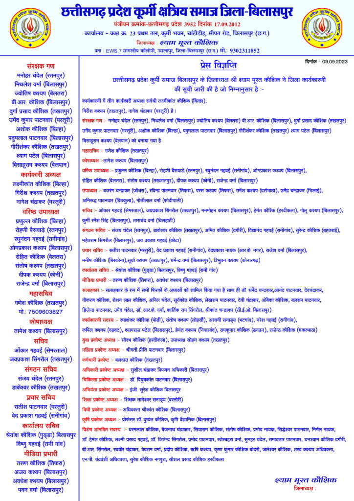 प्रचार सचिव, सतीश पाटनवार मस्तूरी, वेदप्रकाश गहवई रानीगांव, वेदप्रकाश नायक बिलासपुर, राजेश वर्मा बिलासपुर, मनीष कौशिक बिरकोना, सूर्या कश्यप तखतपुर, धर्मेंद्र वर्मा बिलासपुर, त्रिभुवन कश्यप कोनारगढ़,