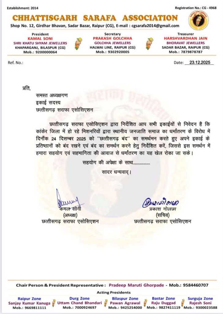 छत्तीसगढ़ सराफा एसोसिएशन अपने सभी 120 इकाई एवं उनके सदस्यगण कांकेर जिला में हो रहे मिशनरियों द्वारा स्थानीय जनजाति समाज का धर्मांतरण का घोर निंदा करता है तथा इसके विरोध में छत्तीसगढ़ चेम्बर ऑफ कामर्स एण्ड इंडस्ट्रीज के दिनाँक 24 दिसम्बर 2025 को “छत्तीसगढ़ बंद” का पूर्ण समर्थमन करता है।