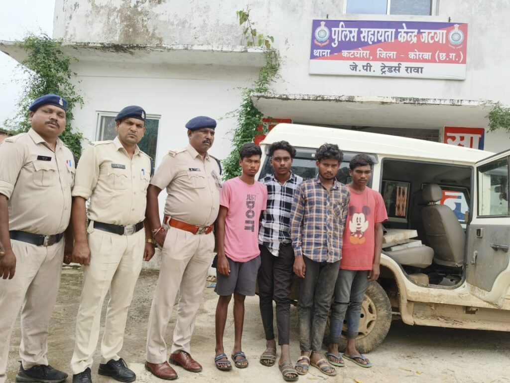 वरिष्ठ अधिकारियों के मार्गदर्शन अनुसार चौकी जाटगा पुलिस के द्वारा विवेचना दौरान अज्ञात 3-4 लूटेरों का पता साजी किया गया जो पतासाजी के दौरान जरिये मुखबीर के सूचना मिली कि ग्राम केशलपुर तरफ जंगल में एक संदिग्ध बिना नम्बर की बोलेरो वाहन खडी है कि सूचना पर हमराह स्टाफ के घेरा बंदी किया गया जो उक्त बिना नम्बर की बोलेरो वाहन में कुछ लोग केशलपुर तरफ से तेज गति में मेन रोड की ओर जाते हुए दिखे जिनका पीछा किया गया जो शासकीय प्राथमिक शाला कटोरी नगोई के सामने उक्त बोलेरो वाहन को छोडकर उसका चालक व एक अन्य व्यक्ति मौके से भाग गए बोलेरो वाहन के बीच सीट व पीछे में बैठे 04 व्यक्ति पकडे गए बोलेरों वाहन को चेक करने पर बोलेरो वाहन के बीच सीट में 04 नग लोहे की मोटी प्लेटे तथा उक्त बोलेरो वाहन का नम्बर प्लेट मिला जिसमें बोलेरो का वाहन का नम्बर सी०जी० 10 ए०एच० 9017 मिला पकड़े गए चारों व्यक्तियों से पृथक पृथक पूछताछ किया गया जो अपना नाम क्रमश- (1), शेष कुमार श्याम पिता राम नारायण सिंह उम्र 21 वर्ष निवासी ग्राम बनखेता चौकी जटगा थाना कटघोरा, जिला कोरबा । (2) शेष पाल चौहान पिता होरी लाल चौहान उम्र 18 वर्ष साकिन डग्गूपारा ग्राम पुटुवा चौकी जटगा (3) सूरज कंवर पिता चंद्र भुवन कंवर उम्र 19 वर्ष साकिन बरबसपुर पुलिस सहायता केन्द्र जटगा (4) मोहीत कुमार यादव पिता लक्ष्मण लाल यादव उम्र 20 वर्ष साकिन बरबसपुर पुलिस सहायता केन्द्र जटगा का निवासी होना बताए आरोपियों के विरुद्ध पर्याप्त सबूत पाए जाने से आरोपियों को गिरफ्तार कर न्यायिक रिमांड पर भेजा गया।
