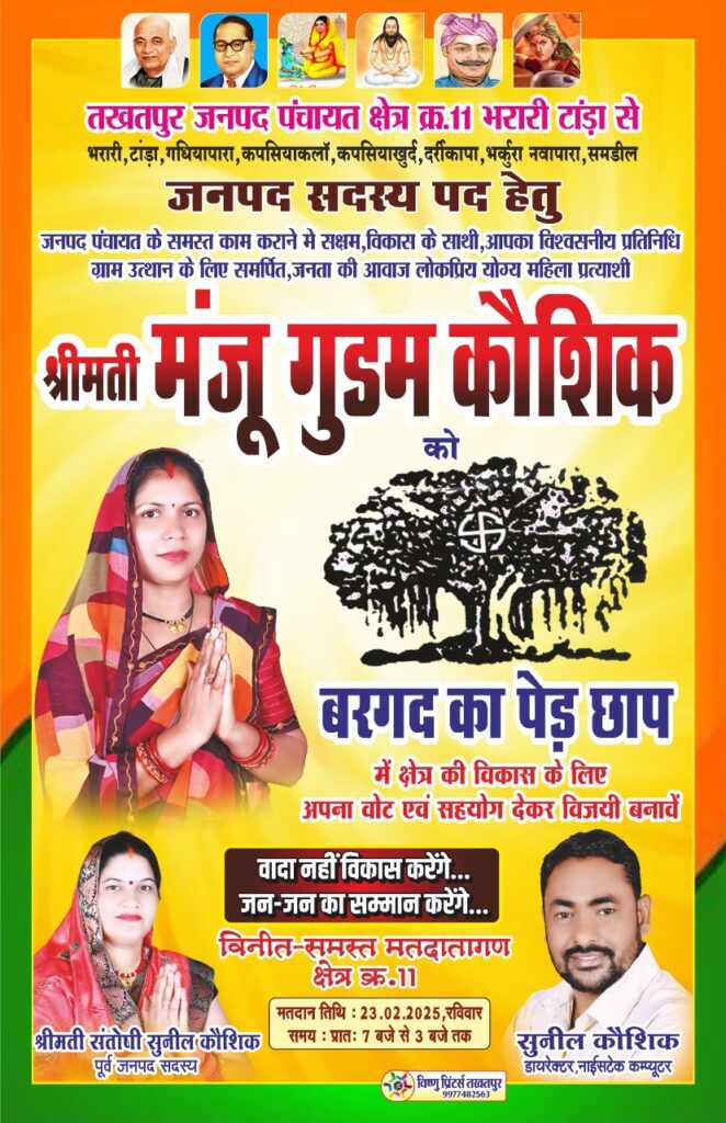 *23 फरवरी को जनपद सदस्य के लिए बरगद का पेड़ छाप अपना मत और आशीर्वाद देकर भारी मतों से विजयी बनाकर, अपने गाँव की तकदीर बदलें!*