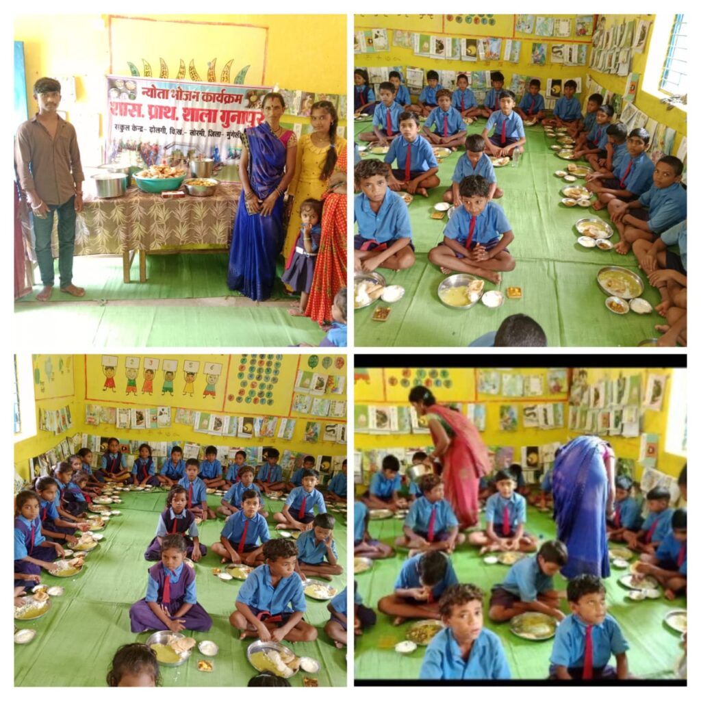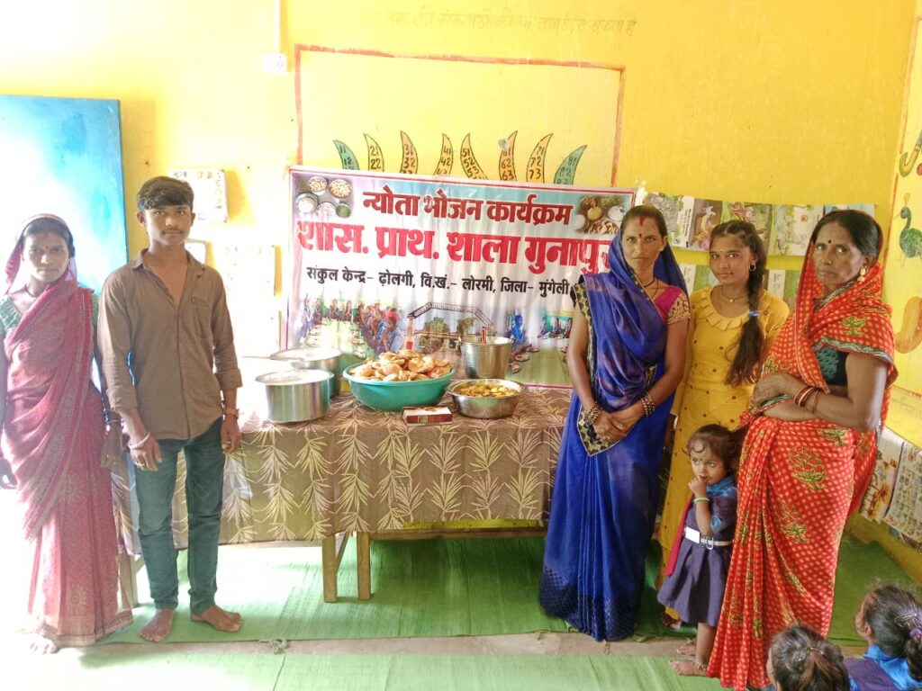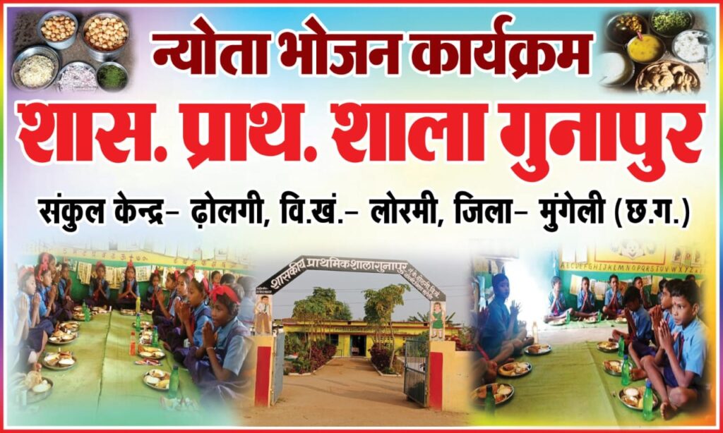 लोरमी, मुंगेली:-प्रधानमंत्री पोषण आहार योजना के तहत तिथि भोजन को छत्तीसगढ़ सरकार ने न्योता भोजन के नाम से योजना लागू की गई हैं।यह योजना सामुदायिक भागीदारी पर आधारित हैं। इसके तहत शासकीय प्राथमिक शाला गुनापुर संकुल केन्द्र ढोलगी विकास खण्ड लोरमी जिला मुंगेली को गुनापुर निवासी सालिक राम साहू के द्वारा अपने पुत्र और पुत्री के जन्मदिन के अवसर पर न्योता भोजन कराया गया।जिसमें खीर, पूड़ी, छोले, आलू सब्जी की ब्यवस्था किया गया।इस अवसर पर उनके परिवार से द्रोपती,हिमांशु,दीपांजलि, किशन, कुमारी बाई, आशा, उपस्थित थे।न्योता भोजन पाकर सभी बच्चे खुश हुए।प्रधान पाठक रघुनाथ राठौर ने कहा कि शाला के विकास एवं विद्यार्थियों के सर्वागीण विकास के लिए समुदाय की सहयोग बहुत ही जरूरी है। बिना समुदाय के सहयोग के विकास हो पाना सम्भव नही है।इस अवसर पर शाला के एस एम सी अध्यक्ष श्री दीपक साहू ने इस योजना की सराहना कि तथा विद्यार्थियों के लिए लाभ दायक हैं कहा। इस योजना के तहत ग्रामवासियों के यह पांचवा न्योता भोज है । इस अवसर पर शाला में शिक्षक रूपेश राजपूत , कुमार साहू, सफाईकर्मी कोमल यादव रसोईया कुमारी,सरोजिनी बैगा आदि उपस्थित रहे।