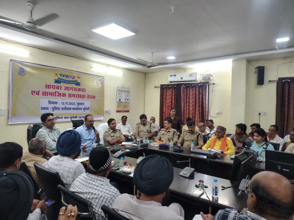 तिजराम साहू ब्यूरो मुंगेली जिला कलेक्टर श्री कुंदन कुमार (भा.प्र.से.) की उपस्थिति में पुलिस अधीक्षक श्री भोजराम पटेल (भा.पु.से.) के मार्गदर्शन पर पुलिस विभाग द्वारा चलाये जा रहे अभियान *‘‘पहल’’* के तहत संवाद सभा कक्ष पुलिस अधीक्षक कार्यालय मुंगेली में सामाजिक समरसता बनाये रखने हेतु सामाजिक जागरूकता बैठक का आयोजन किया गया। बैठक में साइबर अपराध, यातायात नियम के पालन, नशामुक्ति एवं बच्चों व महिलाओं से संबंधित अपराधों के संबंध में जानकारी देते हुये सामाजिक स्तर पर सामाजिक बुराईयां एवं कुरितियां साइबर फ्रॉड के प्रलोभन में नहीं आने, नशा से दूर रहने तथा यातायात नियमों का पालन करने व कम उम्र के बच्चों को वाहन चलाने पर प्रतिबंधित करने के संबंध में बातें बतायी। बैठक में जिले के 150 से अधिक समाज प्रमुख एवं सामाजिक प्रतिनिधिगण उपस्थित रहे।