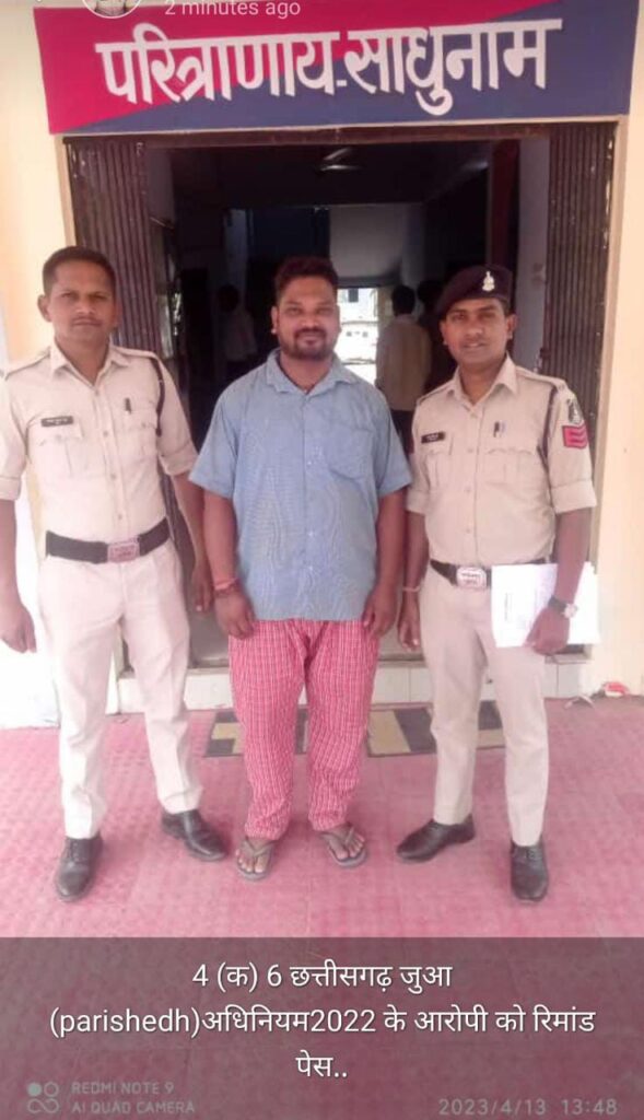मुंगेली,,जिले में अवैध गतिविधियों के विरूद्ध लगातार कार्यवाही की जा रही है। जिसमें विभिन्न थाना/चौकी द्वारा अलग-अलग स्थानों पर दबिश देकर जुआ-सट्टा खेल रहे आरोपियों के विरूद्ध वैधानिक कार्यवाही की गई है। इसी क्रम में थाना मुंगेली द्वारा मुखबिरों की सूचना पर गोलबाजार में दबिश देकर सट्टा खेल रहे आरोपी कृपाल देवांगन के कब्जे से राशि 600/- रूपये एवं 01 नग मोबाईल जप्त कर आरोपी के विरूद्ध थाना मुुंगेली में अपराध क्रमांक 169/23 धारा 4 क, जुआ एक्ट एवं छ.ग. जुआ प्रतिषेध अधिनियम 2022 की धारा 6 के तहत की गई कार्यवाही करते हुए न्यायिक अभिरक्षा में जेल भेजा गया।