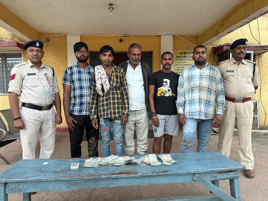 मनोज साहू ब्यूरो जांजगीर चांपा:- मामले का संक्षिप्त विवरण इस प्रकार है कि दनांक 01.11.23 को मुखीबर सूचना मिला कि *थाना अकलतरा क्षेत्र के ग्राम ग्राम खोड़ रेलवे लाइन किनारे तालाब के पास में कुछ लोग रूपयें पैसा का दांव लगाकर, काट पत्ती नामक जुआ खेल रहें है* कि सूचना पर रेड कार्यवाही किया गया मौके पर आरोपी (01) संजीत निवासी मुरली थाना मुलमुला (02) कमल जोगी निवासी मुरलीडी थाना मुलमुला (03) प्रमोद कुमार रत्नाकर साकिन सजापाली थाना अकलतरा (04) राहुल राठौर खोखरा थाना जांजगीर (05) प्रजा जोगी निवासी मुरलीडी थाना मुलमुला को जुआ खेलते पाया गया आरोपियों के कब्जे से जुमला *नगदी रकम 31920 /रूपया एवं 52 पत्ती तास एवम घटना स्थल पर मोटर साइकिल बजाज सिटी 100 क्र. CG- 11-AS- 6219 कीमती 25000 / रू, मो.सा होंडा शाइन बिना नंबर किमती 35000/ रू को समक्ष गवाहन के बरामद किया*।