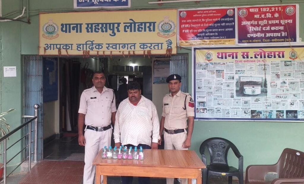 कबीरधाम,श्रीमान पुलिस अधीक्षक डॉ0 अभिषेक पल्लव के मार्गदर्शन मे एंव अति0 पुलिस अधीक्षक हरीश राठौर अनुविभागीय अधिकारी श्री संजय सिंह ध्रुव के दिशा निर्देशन मे थाना प्रभारी विकास बघेल के द्वारा थाना क्षेत्र मे लगातार अपराधो की रोकथाम एंव अपराधीयो के विरूध्द लगातार प्रभावी कार्यवाही की जा रही है इसी क्रम मे आज दिनांक 25/08/23 को जुर्म जरायम पतासाजी दौरान मुखबीर द्वारा प्राप्त सूचना पर शांतिनगर पुल के पास स0 लोहारा मे आरोपी जगदेव पिता लालाराम देवांगन उम्र 50 साल साकिन बिडोरा थाना स0 लोहारा जिला कबीरधाम के कब्जे से 25 नंग देशी प्लेन शराब प्रत्येक मे 180 एम एल शराब भरी हुई कुल 4.500 बल्क लीटर किमती 2000 रूपये एंव बिक्री रकम 200 कुल जुमला 2200 रूपये को जप्त कर कब्जा पुलिस लिया गया आरोपी के विरूध्द अपराध क्रमांक 185/23 धारा 34(1)ख आबकारी एक्ट का अपराध पंजीबध्द कर विवेचना मे लया गया ।