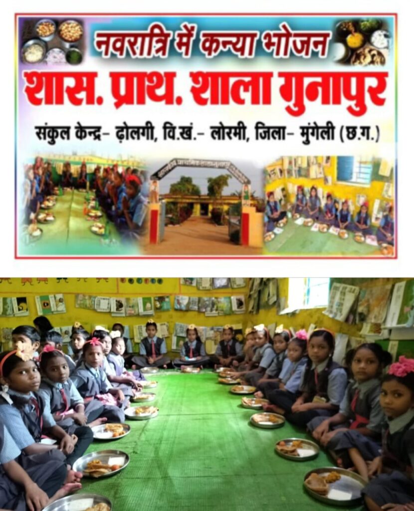 तिजराम साहू ब्यूरो मुंगेली लोरमी-शासकीय प्राथमिक शाला गुनापुर संकुल केन्द्र ढोलगी विकास खण्ड लोरमी जिला मुंगेली में शाला परिवार गुनापुर की ओर से नवरात्रि के पावन पर्व पर कन्या भोज का आयोजन किया गया ।जिसमे विद्यालय के सभी बालिकाओं का पैर घोकर माहौर लगाकर फूल चढ़ाया गया तथा केला, लड्डू ,खीर, पूड़ी,भजिया, छोले- आलू सब्जी,और श्रृंगार आदि समान प्रदान किया गया। प्रधान पाठक रघुनाथ राठौर ने कहा कन्याएं साक्षात देवी स्वरूपा होती है ,ये हमेशा पूजनीय और सम्मानिय होती है। इस अवसर पर सहायक शिक्षक रूपेश राजपूत उनकी घर्मपत्नी श्रीमती अम्बे राजपूत, पुत्री प्राची राजपूत रसोईया कुमारी बाई साहू,लता केंवट, पंच आशा,सफाई कर्मी कोमल यादव ,शांति देवी, रेशम बाई,आदि ग्रामवासी उपस्थित थे। विभिन्न प्रकार के भोजन और श्रृंगार समाग्री पाकर सभी बच्चे बहुत खुश हुए।