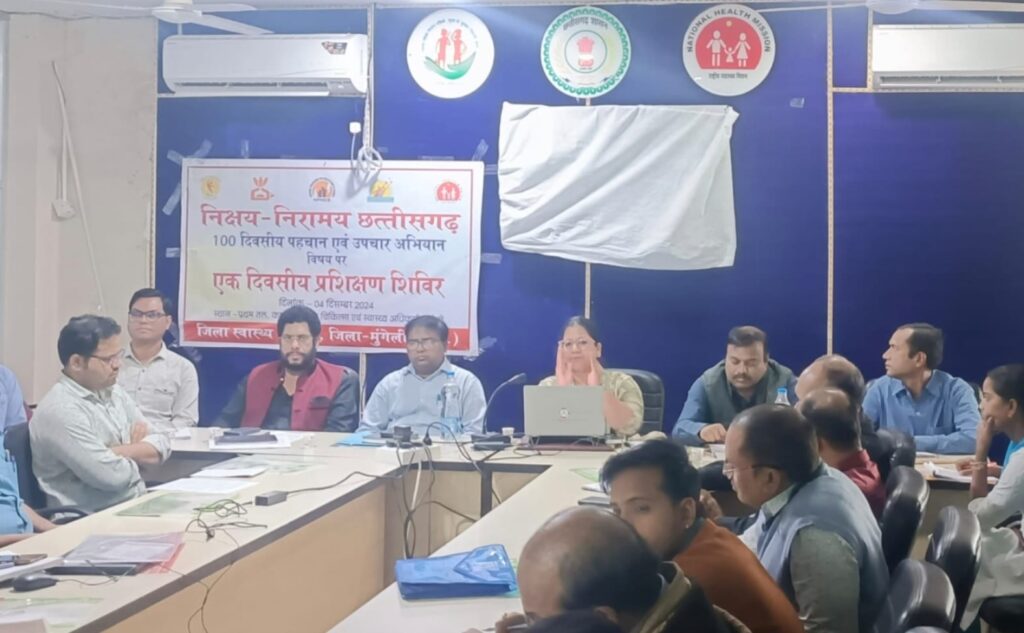 तिजराम साहू ब्यूरो मुंगेली // कलेक्टर श्री राहुल देव के निर्देशानुसार 100 दिवसीय निक्षय-निरामय छत्तीसगढ़ पहचान एवं उपचार अभियान, टीबी, कुष्ठ एवं वयोवृद्ध देखभाल हेतु सीएमएचओ कार्यालय के सभाकक्ष में एक दिवसीय जिला स्तरीय प्रशिक्षण सह कार्यशाला का आयोजन किया गया। मुख्य चिकित्सा एवं स्वास्थ्य अधिकारी डॉ. प्रभातचंद्र प्रभाकर ने बताया कि निक्षय-निरामय छत्तीसगढ़ पहचान एवं उपचार अभियान 07 दिसंबर से 24 मार्च तक 04 चरणों में सभी विकासखण्डों में आयोजित किया जाएगा। जिला कार्यक्रम प्रबंधक श्री गिरीश कुर्रे ने अभियान के दौरान मितानिनों को घर-घर सर्वे कर उच्च जोखिम एवं टीबी, कुष्ठ, शंकास्पद, वयोवृद्ध देखभाल संबंधी जानकारी देने और पीड़ित पाए जाने पर उपचार प्रारंभ कर नियमित फॉलोअप लेने के निर्देश दिए। जिला क्षय उन्मूलन अधिकारी डॉ. सुदेश रात्रे ने कार्यक्रम की विस्तृत जानकारी दी। इस दौरान चिकित्सकों सहित समस्त नोडल अधिकारी और स्वास्थ्य अमला मौजूद रहा।