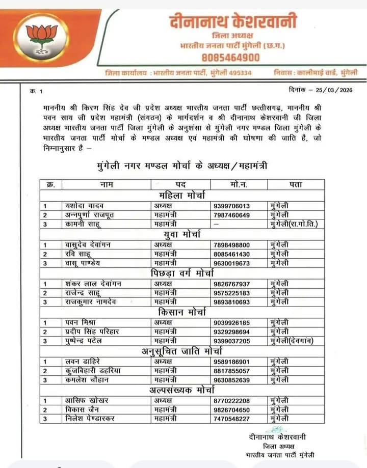 तीजराम साहू ब्यूरो मुंगेली भारतीय जनता पार्टी संगठन मैं कसावट लाने और किसानों के मुद्दों को प्रखरता से उठाने के उद्देश्य से नियुक्तियां का सिलसिला जारी है। इसी क्रम में संगठन द्वारा पवन मिश्रा को किसान मोर्चा मुंगेली मंडल का अध्यक्ष नियुक्त किया गया है उनकी इस नियुक्ति में क्षेत्रीय कार्यकर्ताओं और किसान में उत्साह का माहौल है। पवन मिश्रा की सक्रियता और किसानों के प्रति उनके समर्पण को देखते हुए भाजपा जिला नेतृत्व ने उन्हें यह महत्वपूर्ण जिम्मेदारी सौंपी है। नियुक्ति की घोषणा होते ही समर्थकों उन्हें बधाई देते हुए विश्वास जताया है कि उनके नेतृत्व मैं किसान मोर्चा क्षेत्र मैं और अधिक सशक्त हगा। अपनी नियुक्ति पर आभार व्यक्त करते हुए। नवनियुक्त मडल अध्यक्ष पवन मिश्रा ने कहा कि संगठन ने उन्हें जो जिम्मेदारी दी है।