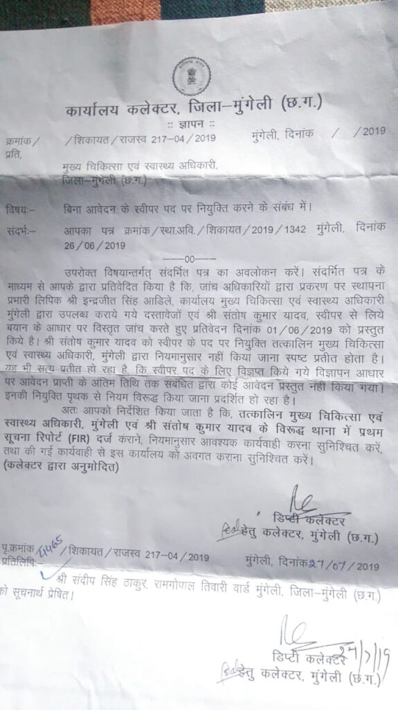 *पूर्व CMHO ऊपर एफ आई आर दर्ज करने का कलेक्टर का वर्ष 2019 का आदेश, पुलिस प्रशासन टी आई बेखबर,,,,,पढ़े पूरी खबर।*