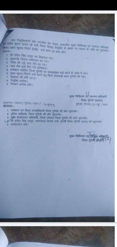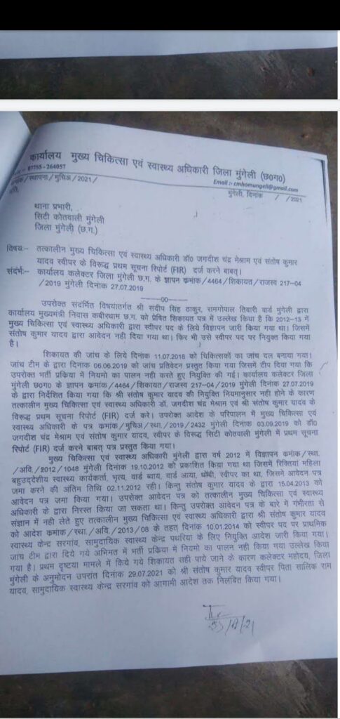 मुंगेली = मुंगेली जिले के पूर्व cmho डॉ जगदीश चंद्र मेश्राम व संतोष कुमार यादव के ऊपर एफ आई आर दर्ज करने का आदेश कलेक्टर डॉ सर्वेश्वर नरेन्द्र भूरे ने वर्ष 2019 में दिया था, लेकिन अब तक इस मामले में एफ आई आर दर्ज नहीं हुआ है, कलेक्टर के आदेश पर टी आई कोतवाली को उस समय के तत्कालीन cmho ने आवेदन दिया था व दस्तावेज उपलब्ध कराया था, व पुलिस अधीक्षक महोदय को भी सूचित किया गया था, बताते चले कि कलेक्टर ने विधिवत रूप से सम्पूर्ण मामले में जॉच किया था, लेकिन इस पूरे मामले में लीपापोती कर पुलिस विभाग द्वारा मामले को दबा दिया गया था, ताकि कार्रवाई ना हो सके, ऐसा प्रतीत हो रहा है, क्योंकि कलेक्टर ने स्पष्ट रूप से इस मामले में जॉच किया था व बकायदा इस मामले में जॉच कर कार्यवाही के लिए आदेश जारी किया था, लेकिन 7 साल बाद भी अब तक कार्यवाही नहीं होना विभागीय अधिकारियों की मिलीभगत संलिप्तता को दर्शाता हैं,