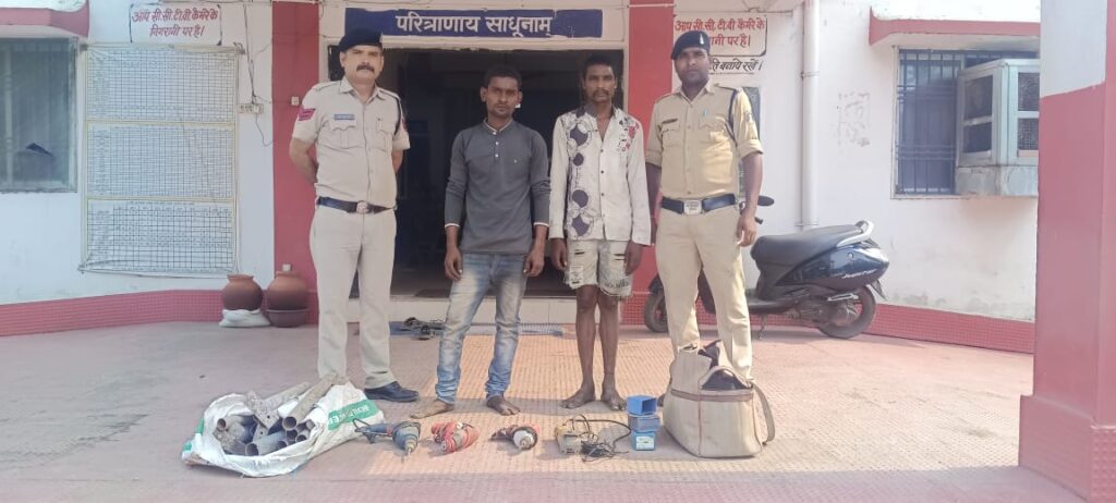 दौरान विवेचना के घटना स्थल निरीक्षण कथन, एवं घटना स्थल से टूटा हुआ चैन, ताला जप्त किया गया तथा अज्ञात चोर की पतासाजी किया जा रहा था कि मुखबीर से सूचना मिला की दिनांक 09-10.06.2024 के दरम्यिानी रात्रि जनपद कार्यालय के पीछे देवार मोहल्ला के कुछ लोगों को घुमते देखा गया है जिसकी पतासाजी की जा रही थी कि मुखबीर द्वारा सूचना मिला की देवार मोहल्ला बलौदा के विरेन्द्र देवार द्वारा अपने अन्य साथी के साथ उक्त घटना को कारित किये है जिन्हे संदेह के आधार पर थाना लाकर पृथक- पृथक पुछताछ किया गया जिनके द्वारा अपने मेमोरेण्डम कथन में चोरी करना स्वीकार किये एवं चोरी किये हुये हेंड गे्रेंडर तीन नग, ड्रील मशीन, झोला में रखा सामान स्क्रु और कटे हुये पाईप को अपने- अपने घर में छिपा कर रखना बताये आरोपीयों के निशादेही पर उनके घर से चोरी हुये संपत्ति को गवाहों के समक्ष बरामद किया गया आरोपीयों का उक्त कृत्य अपराध धारा का सबूत पाये जाने से *आरोपी* (01) विरेन्द्र देवार पिता छतलाल देवार उम्र 22 वर्ष सा0 देवार मोहल्ला बलौदा थाना बलौदा (02) मुकेश देवार पिता रमेश देवार उम्र 27 वर्ष साकिन देवार मोहल्ला बलौदा थाना बलौदा जिला जांजगीर-चांपा को दिनांक 12.06.2024 को विधिवत गिरफ्तार न्यायिक रिमांड पर भेजा गया है। तथा प्रकरण में शामिल एक विधि विरुद्ध संघर्षरत बालक को किशोर न्यायालय पेश उपरांत बाल संप्रेक्षण गृह कोरबा भेजा गया है।