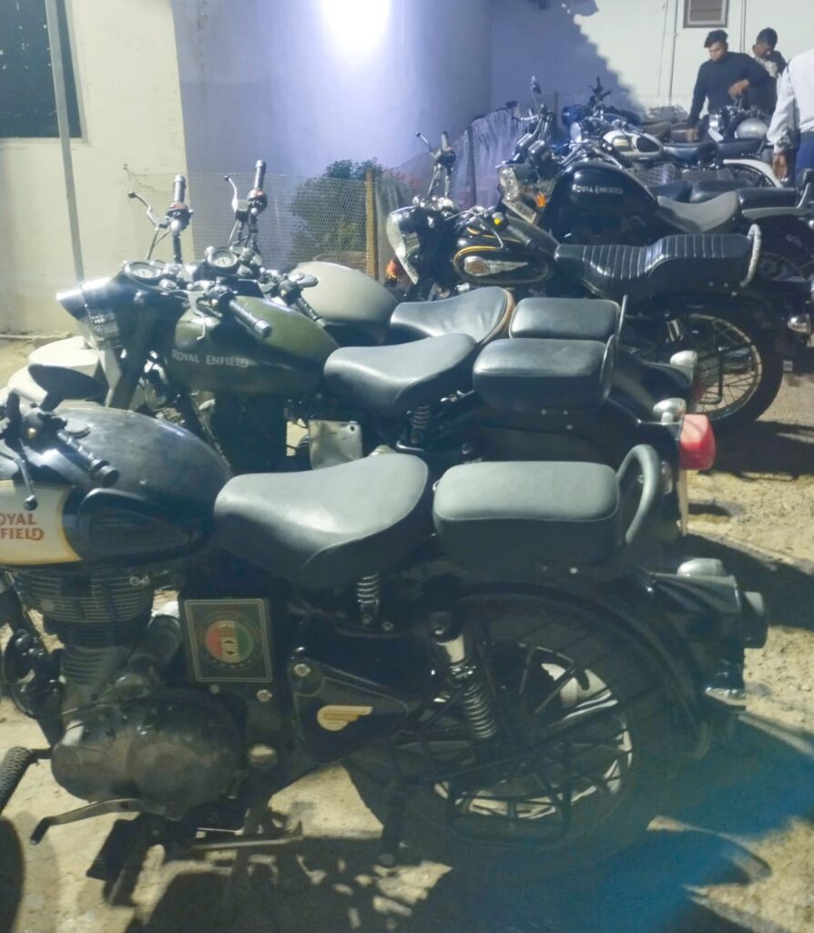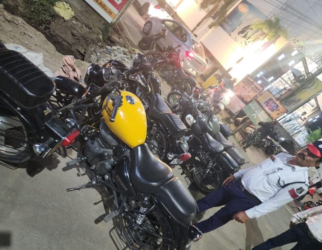 चेकिंग के दौरान रॉयल इनफील्ड कंपनी की मोटरसाइकिल के ओरिजिनल साइलेंसर को निकालकर अधिक और कर्कश आवाज करने वाले साइलेंसर लगाकर मोटरसाइकिल चलाने वालों की गाड़ियों की जांच की गई । जांच में मिली अवैधानिक गाड़ियों पर MV एक्ट के अंतर्गत कार्यवाही की गई है यह कार्यवाही लगातार जारी रहेगी।
