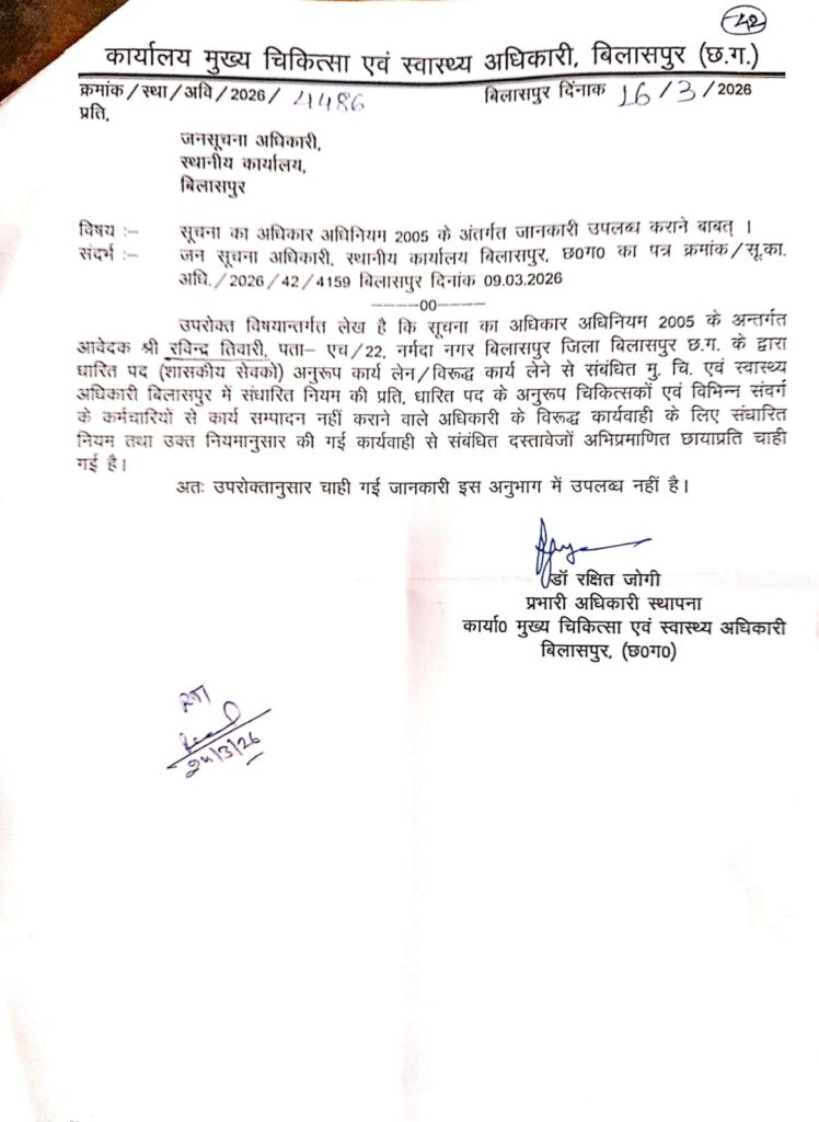 ऐसा स्वयं मुख्य चिकित्सा एवं स्वास्थ्य अधिकारी बिलासपुर जिला कार्यालय के *स्थापना प्रभारी अधिकारी डॉक्टर रक्षित जोगी* अपने पत्र के माध्यम से प्रमाणित कर रहे हैं ।