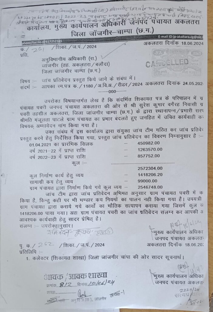 बात दें की पचरी पंचायत के प्रभारी सरपंच पर भ्रस्टाचार की शिकायत हुई थी जिसमे जनपद पंचायत द्वारा 6 सदस्यी जांच टीम गठित किया गया था । भ्रस्टाचार की जांच मे 6 सदस्यी टीम ने प्रभारी सरपंच द्वारा 25 लाख 45 हजार से अधिक का आहरण करने तथा मात्र 14 लाख के लगभग ही विकासकार्य मे खर्च करने पाया गया । भ्रस्टाचार की जांच कर 6 सदस्यी टीम ने जनपद पंचायत मे जांच प्रतिवेदन प्रस्तुत कर दिया गया । भ्रस्टाचार के इस जांच मे कारवाई करने के बजाय जिम्मेदार अधिकारियों के द्वारा भ्रस्टाचार को बढ़ावा देने समय पर कोई कारवाई नही किया जा रहा है ।