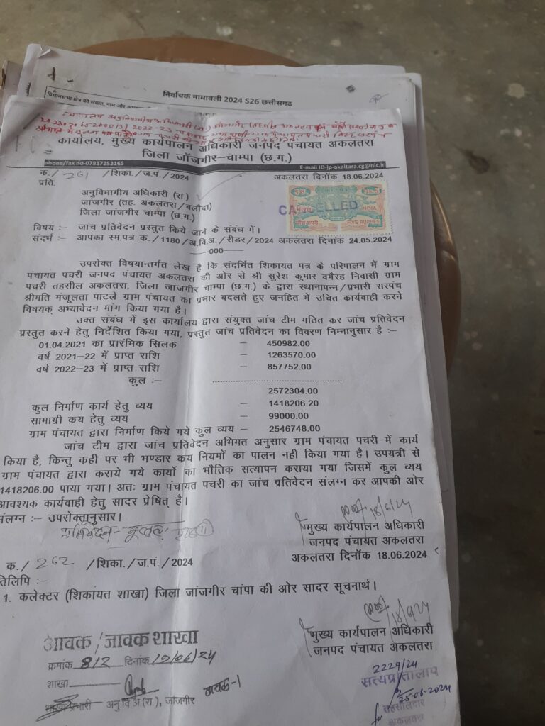 मनोज साहू ब्यूरो जांजगीर चांपा जांजगीर जिले के अकलतरा क्षेत्र अंतर्गत ग्राम पंचायत पचरी में भ्रष्टाचार का मामला तूल पकड़ रहा है