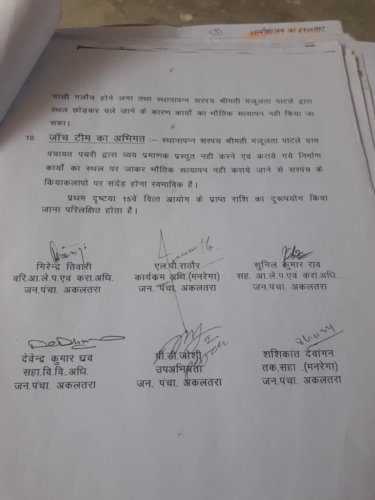 गौरतलब है कि भ्रष्टाचार के इस गंभीर मामले में जनपद पंचायत अकलतरा द्वारा गठित 6 सदस्यीय जांच दल ने प्रभारी सरपंच पर विकास कार्य के नाम पर 25 लाख 72 हजार का आहरण पाया गया । प्रभारी सरपंच के द्वारा 25 लाख 72 हजार में मात्र 14 लाख के काम का ही पुष्टि हुआ । जांच दल के द्वारा भ्रष्टाचार की पुष्टि कर प्रतिवेदन प्रस्तुत किया गया।