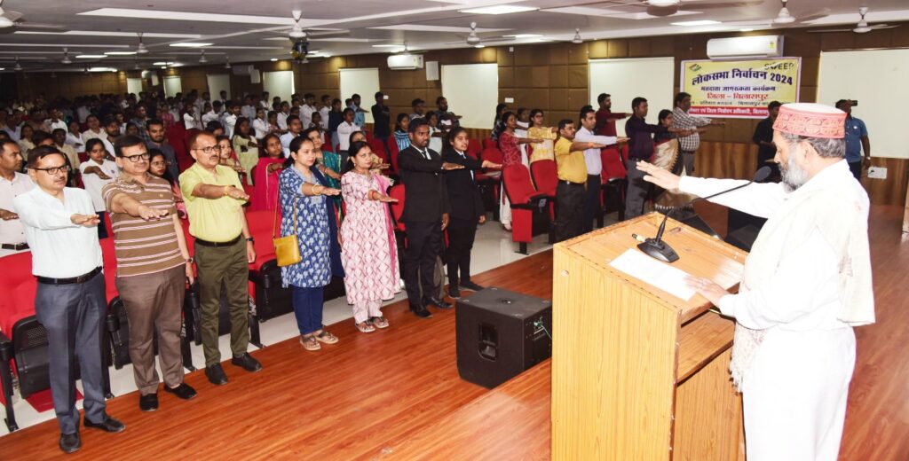 *कुलपति आचार्य श्री बाजपेई ने दिलाई मतदाता शपथ-* कार्यक्रम में कुलपति आचार्य श्री बाजपेई द्वारा सभी लोगों को देश की लोकतांत्रिक परम्परा बनाये रखने तथा निर्भीक होकर अपने मताधिकार का प्रयोग करने की शपथ दिलाई गई।