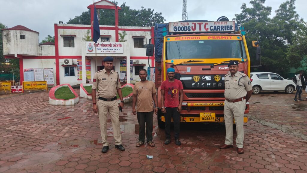 जांजगीर:- रविवार केई रात्रि में थाना जांजगीर पुलिस को मुखबीर से सुचना मिला कि एक वाहन में मवेशियों को भरकर ले जा रहा है की सूचना पर रेड कार्यवाही कर मुनुन्द मोड़ फोरलेन मे वाहन क्रमांक CG-04- NS 8825 वाहन को रोककर वाहन में सवार चालक को पूछताछ किया गया मौके पर आरोपी जितेन्द्र कुमार संकवार निवासी सत्ती पो. भोगनी थाना सत्ती जिला कानपुर (उ.प्र) द्वारा अपने मेमोरंडम मे जुर्म स्वीकार कर अपने साथी गुलजार अहमद के साथ अपने एक अन्य साथी के कहने पर उक्त वाहन को लेकर पामगढ़ जाने वहां वाहन मे 20 नग मवेशी लोड कराया तथा 10,000/- रूपये खर्च हेतु देकर तथा हेल्फर को 1000/- भत्ता देने वाहन का कोई कागज नही देने तथा मवेशी का कोई रसीद आदि नही होना बताया है वाहन आयसर डी.सी.एम. CG -04-NS 8825 मय चाबी तथा 20 नग भैस -भैसा नगदी रकम 10,000/- एक नग विवो मोबाईल, चालक लायसेंस को पेश करने तथा आरोपी गुलजार अहमदवार्ड नं. 24 आजाद चौक श्यामली थाना कोतवाली श्यामली जिला श्यामली (उ.प्र.) के द्वारा मोबाईल को पेश करने पर समक्ष गवाहो के बरामद किया गया है आरोपी 01. जितेन्द्र कुमार संकवार 02. गुलजार अहमद को गिरफ्तार कर न्यायिक रिमांड पर जेल भेजा गया।