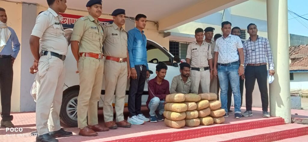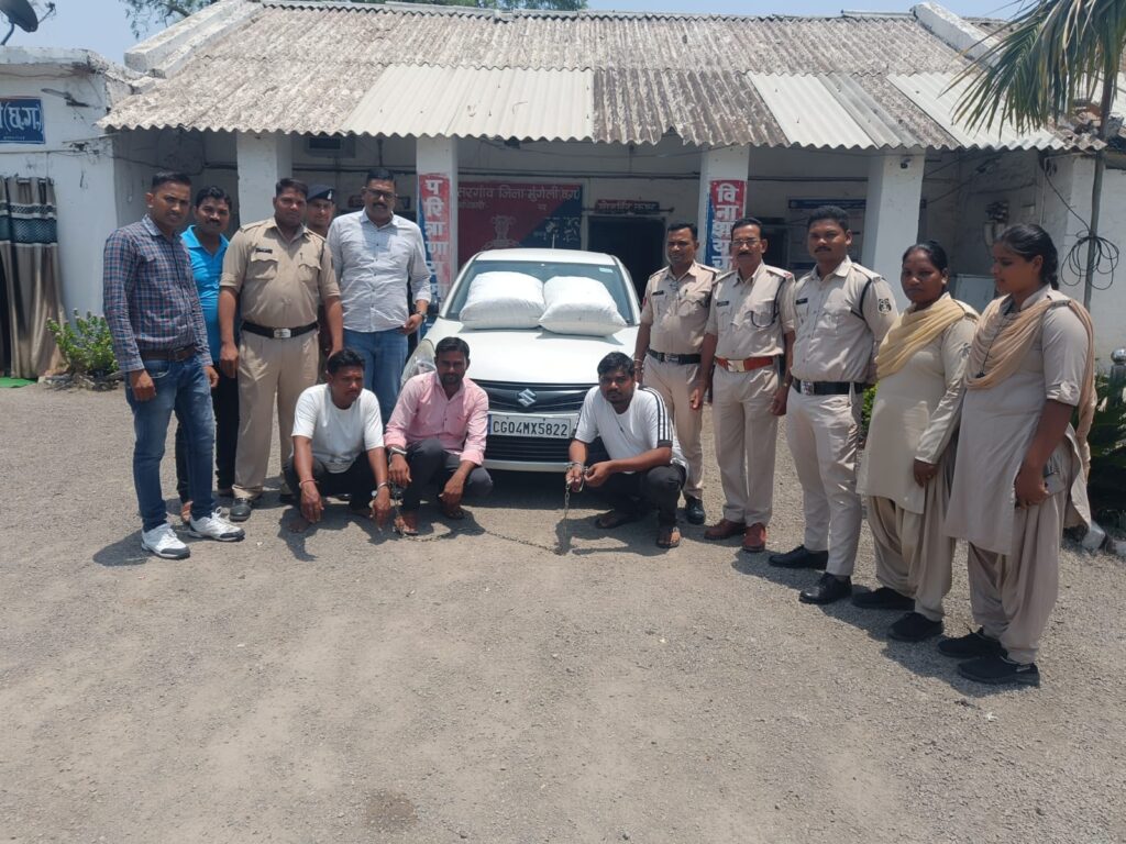मुंगेली,,मामले का संक्षिप्त विवरण इस प्रकार है कि दिनांक 21.05.2023 को थाना मुंगेली को मुखबिरों से एक सफेद सेंट्रो कार क्रमांक सीजी 10 एफए 3915 के अवैध में मादक पदार्थ गांजा पथरिया की ओर से बाईपास रोड मुंगेली होते हुए पण्डरिया की ओर जा रहा है कि सूचना पर सिटी कोतवाली मुंगेली पुलिस द्वारा नवागढ रोड चौराहा लिलवाकापा के पास घेराबंदी कर दो आरोपियों 01. भुनेश चन्द्राकर एवं 02. तोरन साहू को गिरफ्तार कर आरोपियों के कब्जे से 30 किग्रा मादक पदार्थ गांजा कीमती 150000/- रूपये एवं परिवहन में प्रयुक्त सेंट्रो कार कीमती 400000/- रूपये कुल कीमती 550000/- रूपये जप्त कर आरोपियों के विरूद्ध अपराध क्रमांक 213/2023 धारा 20(ब) एन.डी.पी.एस. एक्ट के तहत की गई कार्यवाही कर न्यायिक अभिरक्षा में जेल भेजा गया।