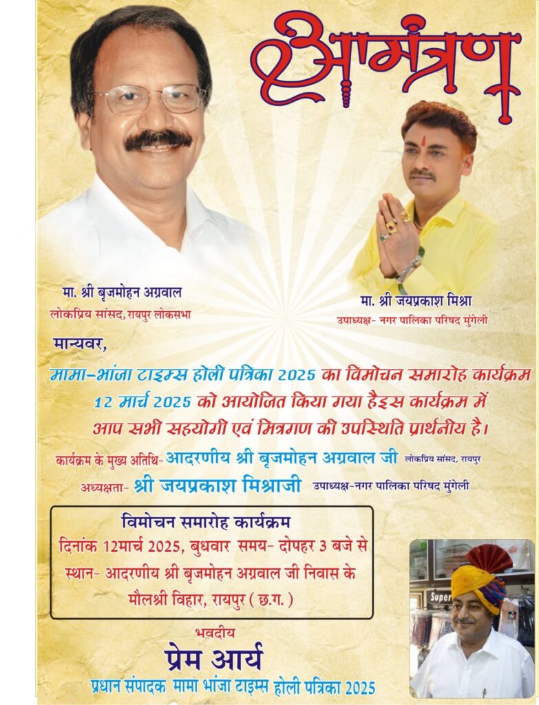 तिजराम साहू ब्यूरो मुंगेली ✍🏻मामा-भांजा टाइम्स होली पत्रिका 2025 का विमोचन समारोह कार्यक्रम 12 मार्च 2025 को आयोजित किया गया है इस कार्यक्रम में आप सभी सहयोगी एवं मित्रगण की उपस्थिति प्रार्थनीय है। कार्यक्रम के मुख्य अतिथि- आदरणीय बृजमोहन अग्रवाल जी लोकप्रिय सांसद, रायपुर अध्यक्षता – जयप्रकाश मिश्रा उपाध्यक्ष-नगर पालिका परिषद मुंगेली