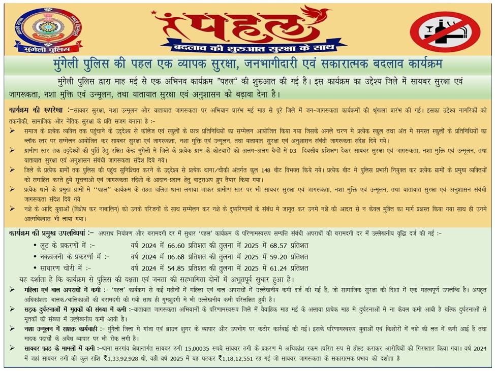 तिजराम साहू ब्यूरो मुंगेली पुलिस द्वारा माह मई से एक अभिनव कार्यक्रम “पहल” की शुरुआत की गई है। इस कार्यक्रम का उद्देश्य जिले में सायबर सुरक्षा एवं जागरूकता, नशा मुक्ति एवं उन्मूलन, तथा यातायात सुरक्षा एवं अनुशासन को बढ़ावा देना है।