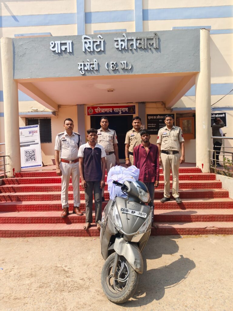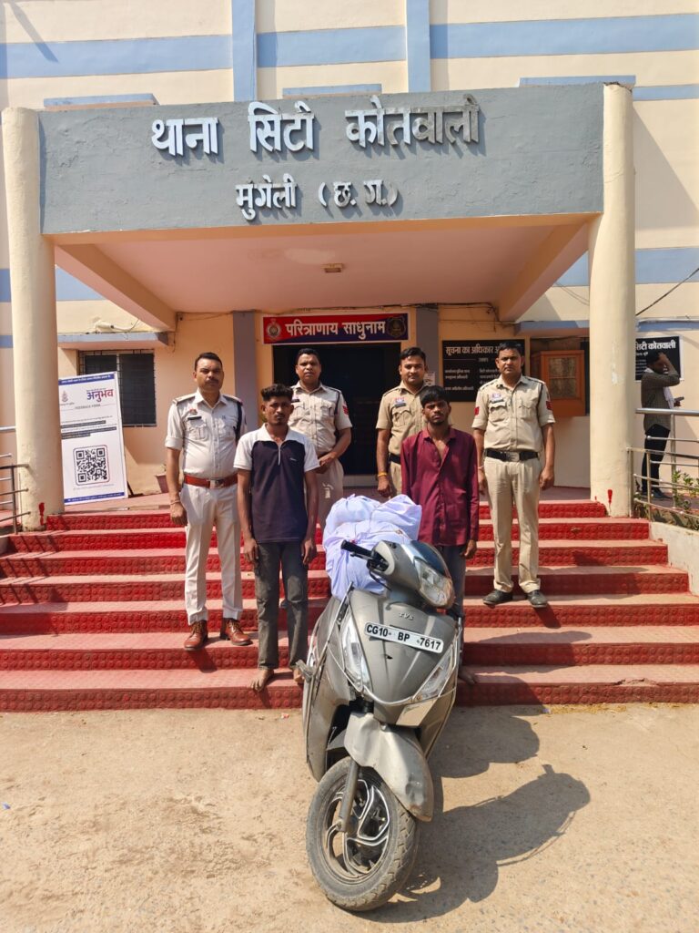 उक्त निर्देश के परिपालन में अतिरिक्त पुलिस अधीक्षक मुंगेली सुश्री नवनीत कौर छाबड़ा एवं उप पुलिस अधीक्षक पथरिया श्री हरविंदर के कुशल मार्गदर्शन पर सायबर सेल मुंगेली एवं थाना सिटी कोतवाली मुंगेली के संयुक्त पुलिस टीम को दिनांक 20.04.2026 को मुखबीर से सूचना मिला कि तीन व्यक्ति एक स्कूटी टी.व्ही.एस. ज्यूपीटर क्रमांक सीजी 10 बीपी 7617 में बिलासपुर जरहागांव की ओर से स्कूटी में भारी मात्रा में अवैध मादक पदार्थ गांजा लेकर गीधा बायपास मुंगेली की ओर आ रहे हैं कि सूचना पर सूचना तस्दीकी हेतु हमराह स्टाफ एवं गवाहों के मुखबीर के बताये स्थल पर पहुंचकर उक्त ज्यूपिटर स्कूटी वाहन को साइबर सेल एवं थाना स्टाफ मंुगेली गीधा बायपास तिराहा मुंगेली पर घेराबंदी कर एक टी.व्ही.एस. ज्यूपीटर स्कूटी क्रमांक सीजी-10 बीपी-7617 पर तीन व्यक्ति सवार होकर आ रहेे थे जिसे रोककर पूछताछ एवं चेक किया गया। स्कूटी चालक ने अपना नाम शिवा पटेल बताया तथा उसके साथ में आदित्य कर्माकर बताये एवं 01 नाबालिग बालक का होना पाया गया। संदेही शिवा पटेल का तलाशी लिया गया, जिसके कब्जे से एक मोटे कपडे की थैला में रखे 09 पैकेट ब्राउन पेपर व झिल्ली से पैकिंग मादक पदार्थ गांजा कुल 9.570 किलोग्राम, एक ग्रे कलर का उपयोगी टी.व्ही.एस. ज्यूपीटर स्कूटी वाहन क्रमांक सीजी-10 बीपी-7617 एवं एक पुरानी इस्तेमाली नीले कलर का ओप्पो कंपनी का मेाबाईल फोन पाया गया एवं संदेही आदित्य कर्माकर के कब्जे से एक प्लास्टिक लाल नीला रंग बोरी के अंदर रखे 13 पैकेट ब्राउन कलर के पेपर व झिल्ली से पैकिंग मादक पदार्थ गांजा कुल वजन 13.174 किलोग्राम एवं एक इस्तेमाली समसंग गैलेक्सी मोबाइल फोन बरामद किया गया।
