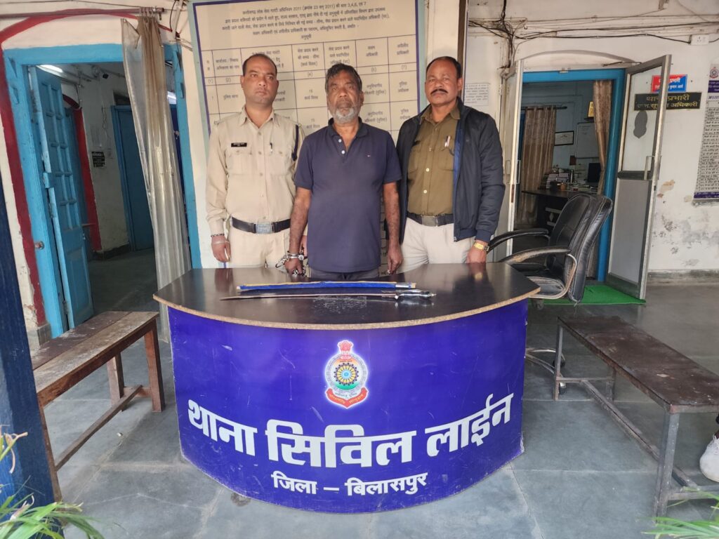 आशीष कश्यप बिलासपुर:-विवरण इस प्रकार है कि दिनांक 15/01/2024 को थाना प्रभारी सिविल लाइन प्रदीप आर्य को सूचना मिला की राजेन्द्र नगर मुख्य डाकघर के पास में एक व्यक्ति लोहे का तलवार लेकर लहराते हुए आने जाने वाले लोगो को गाली गुप्तार कर डरा धमका रहा है कि सूचना से तत्काल श्रीमान पुलिस अधीक्षक महोदय श्री संतोष कुमार सिंह को अवगत कराया गया जिनके द्वारा उक्त आरोपी को तत्काल हिरासत में लेकर कार्यवाही करने निर्देश दिए उक्त निर्देश के पालन में अतिरिक्त पुलिस अधीक्षक महोदय शहर श्री राजेंद्र जयसवाल एवं नगर पुलिस अधीक्षक महोदय सिविल लाइन श्री संदीप पटेल (आईपीएस) के मार्गदर्शन में थाना प्रभारी सिविल लाइन प्रदीप आर्य द्वारा थाना सिविल से सहायक उपनिरीक्षक दिलाराम मनहर के साथ हमारा स्टाफ आरक्षक देवेंद्र दुबे एवं राजेश नारंग को तत्काल मौके पर भेज कर सूचना की तस्दीक कराया जहां एक व्यक्ति को लोहे का तलवार लेकर आम लोगों को डराते धमकाते मिला जो पुलिस को देखकर उसके समक्ष ही मार दूंगा उत्तेजित होकर चिल्लाने लगा जिसे घेरा बंदी कर पुलिस बल की सहायता से पकड़ा गया