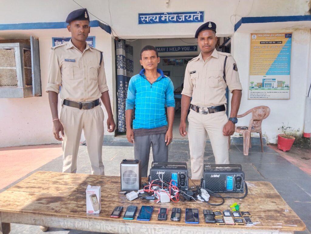 पुलिस श्री सिद्धार्थ बघेल महोदय कोटा के दिशानिर्देश में टीम गठित कर चोरी करने वाले अज्ञात आरोपी के संबंध में ग्रामीणों एवं आसपास के लोगो से पूछताछ किया जा रहा था, इसी दौरान मुखबिर से सूचना मिला कि ग्राम तुमाडबरा निवासी सुखसिंह बैगा चोरी के मोबाईल व मोबाईल सामग्री को बेचने के लिये ग्राहक तलाश कर रहा है। मुखबिर सूचना पर संदेही सुखसिंह बैगा को हिरासत में लेकर पूछताछ करने पर जुर्म स्वीकार किया आरोपी सुखसिंह बैगा के कब्जे से रेडियो 2 नग, बाक्स 01 नग, जियो कंपनी का मोबाईल 2 नग, जियो कंपनी का कीपेड मोबाइल 2 नग, आईटेल कंपनी का कीपेड मोबाईल 2 नग, कार्बन कंपनी का 01 नग मोबाईल, रावर कंपनी का मोबाईल बैटरी 4 नग अन्य कंपनी का मोबाईल बैटरी, मोबाईल चार्जर मय केबल चिप, एयरफोन कीमती लगभग 15000 रूपये जप्त कर कब्जे पुलिस ली गई। आरोपी सुखसिंह बैगा पिता ईतवार सिंह बैगा उम्र 35 वर्ष निवासी तुमाडबरा चौकी बेलगहना थाना कोटा जिला बिलासपुर छ.ग के विरूद्ध धारा सदर का अपराध घटित करना सबूत पाये जाने से विधिवत गिरप्तार कर न्यायिक रिमांड पर भेजा गया। उक्त कार्यवाही में प्रधान आरक्षक भुवनेश्वर मरावी, आरक्षक गोविन्दा जायसवाल, राकेश पोर्ते, कौशल बिन्झवार का विशेष योगदान रहा ।