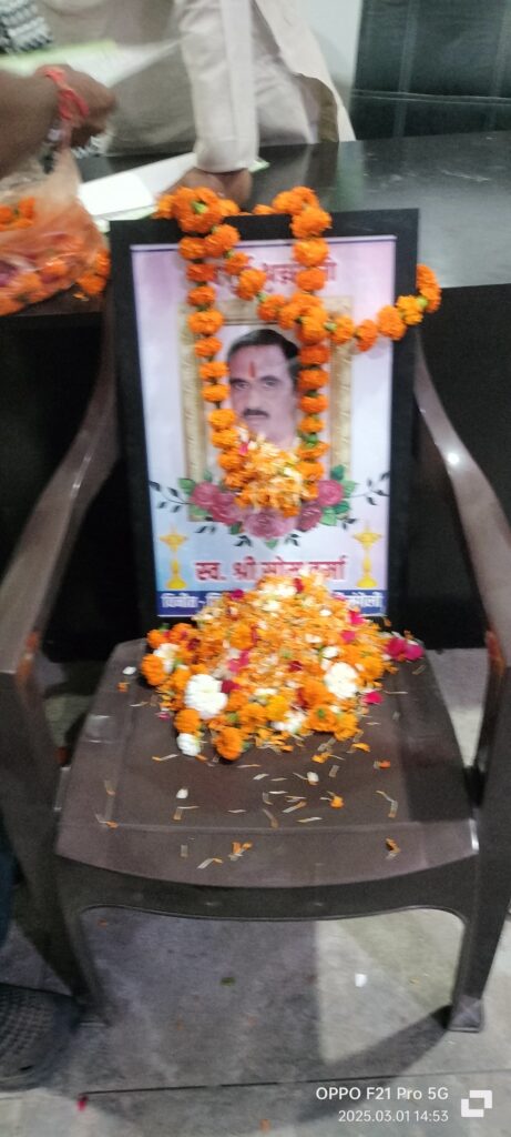 तिजराम साहू ब्यूरो मुंगेली – जिला कांग्रेस कमेटी मुंगेली के महामंत्री एवं पूर्व पार्षद सोम वर्मा के तेल चित्र पर पुष्पांजलि अर्पित करके 2 मिनट का मौन धारण किया गया इस अवसर पर जिला कांग्रेस अध्यक्ष घनश्याम वर्मा ने उन्हें याद करते हुए कहा कि श्री वर्मा सरल एवं कर्मठ व्यक्तित्व के धनी थे,, उनके असमय निधन से एक बडी क्षति हुई है जो अपूर्णीय है। वही शहर कांग्रेस कमेटी के अध्यक्ष स्वतंत्र मिश्रा ने उन्हें याद करते हुए कहा उनका निधन एक बडी क्षति है,, हमनेकांग्रेस के एक सच्चे सिपाही को खो दिया है. इस अवसर पर घनश्याम वर्मा, संजीत बनर्जी,चंद्रभान बारमते, श्याम वर्मा, स्वतंत्र मिश्रा संजय यादव, थानेश्वर साहू,दीपक गुप्ता,जैत राम खांडे,दिलीप बंजारा,सागर सोलंकी,अरविन्द वैष्णव संजय जायसवाल एजाज खोखर मनोज सोनकर श्रवण सोनकर अजय साहू,याक़ूब अली,राजा मानिक,जित्तू श्रीवास्तव श्रीमती उर्मिला यादव,मंजू शर्मा, मोना नागरे नूरजहाँ, निधी सिंह ठाकुर दादू मल्हा,कलेश्व गर्ग,रमेश सिंह राजपूत,बशीर शेख,पुष्पा धृतलहरे,राहुल रुपवानी, साधना वर्मा,शिव कुमार,रवि प्रकाश,मकबूल खान, अरुण कुलमित्र, संदीप यादव शत्रुघ्न सोनकर रवि वर्मा, नवनीत शुक्ला उपस्थित रहे।
