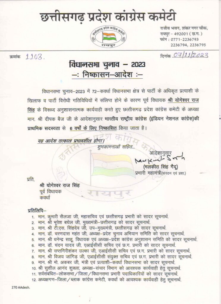 ब्यूरो रायपुर/कवर्धा:- विधानसभा चुनाव में कवर्धा के कांग्रेस प्रत्याशी के खिलाफ और पार्टी विरोधी गतिविधियों में शामिल होने के कारण कवर्धा के पूर्व विधायक योगेश्वर राज सिंह को कोंग्रेस पार्टी की प्राथमिक सदस्यता से छह वर्ष के लिए निष्कासित कर दिया गया है अनुशासनात्मक कार्यवाही करते हुए प्रदेश कांग्रेस अध्यक्ष दीपक बैज के आदेशानुसार ये कार्यवाही की गई हैं योगेश्वर राज सिंह ने कवर्धा सीट पर चुनाव में आप पार्टी के प्रत्याशी खड़ग राज सिंह का खुलेआम प्रचार किया था यहां पर कांग्रेस से मंत्री मोहम्मद अकबर प्रत्याशी थे मतदान होने के बाद ये आदेश जारी किया गया है।