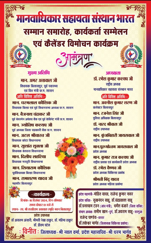 प्रदेश स्तरीय कार्यकर्ता सम्मेलन एवं सम्मान समारोह कार्यक्रम जिसमें शाहिद परिवार जनों का सम्मान कार्यक्रम कार्यकर्ता परिचय सम्मेलन एवं मानवाधिकार सहायता संस्थान भारत का कैलेंडर विमोचन का कार्यक्रम आयोजित किया गया है जिसमें मुख्य अतिथि के रूप में माननीय श्री अमर अग्रवाल जी धरमलाल कौशिक जी बैजनाथ चंद्राकर जी सुशांत शुक्ला जी अटल श्रीवास्तव