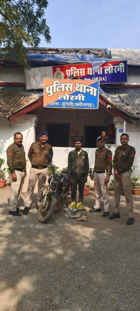तिजराम साहू ब्यूरो मुंगेली श्रीमान पुलिस अधीक्षक महोदय मुंगेली, श्री भोजराम पटेल (भा.पु.से.) के द्वारा अवैध रूप से शराब, जुआ, सट्टा,गांजा तस्करी करने वालो के ऊपर कड़ी कार्यवाही करने हेतु निर्देशित किया गया परिपालन में श्रीमान अतिरिक्त पुलिस अधीक्षक महोदय मुंगेली, श्री पंकज पटेल एवं श्रीमान अनुविभागीय पुलिस अधिकारी लोरमी श्रीमती माधुरी धिरही के मार्गदर्शन पर दिनांक 29.11.2024 को जरिये मुखबीर प्राप्त सूचना पर आरोपी सुजर शिकारी पिता मिश्रा शिकारी साकिन शिकारी डेरा परसवारा को घटना स्थल ग्राम ढोलगी परसवारा रोड़ मे नाकाबंदी कर रोककर पूछताछ करने पर अपने कब्जे में एक मोटर सायकल सीबी जेड कमांक सीजी सीजी 10 ईके 8506 से एक सफेद रंग के थैला मे रखे दो नग प्लास्टिक जेरीकेन क्षमता प्रत्येक 5-5 लीटर में कुल 10 लीटर कच्ची महुआ शराब को रखकर परिवहन करते मिला। आरोपी के द्वारा शराब रखने परिवहन करने संबंधी कोई लाइसेंस नही होना बताया है उक्त शराब को समक्ष गवाहान जप्त कर कब्जा पुलिस लिया जाकर आरोपी के विरूद्ध अपराध धारा सदर का अपराध घटित करना पाये जाने पर अपराध क 454/24 धारा 34 (2) 59 (क) आबकारी एक्ट पंजीबद्ध किया जाकर माननीय न्यायालय न्यायिक रिमाण्ड पर जेल दाखिल किया गया । उक्त प्रकरण में निरीक्षक अखिलेश कुमार वैष्णव प्रधान आरक्षक बालीराम ध्रुव शेषनारायण कश्यप आरक्षक पवन गंधर्व कवि टोप्पो सैनिक कुलदीप सिंह दिलीप राजवूत थाना लोरमी की सराहनीय भूमिका रही।