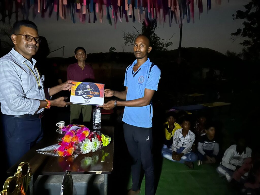 पुलिस अधीक्षक डॉ लाल उमेद सिंह ने नक्सल प्रभावित ग्राम बोदलपानी में आयोजित सामुदायिक पुलिसिंग के तहत क्रिकेट में प्रथम स्थान ग्राम बोदलपानी को 10 हजार रुपए नगद, शील्ड मोमेंटो प्रदान कर समन्नित किया गया। वही दूसरा स्थान मिनमिननिया को 5 हजार रुपए नगद, शील्ड मोमेंटो प्रदान कर समन्नित किया गया। पुलिस अधीक्षक ने मैन ऑफ द मैच खिलाडी को यातायात जागरूकता के प्रति हेलमेट प्रदान किया गया। पुलिस अधीक्षक ने यातायात नियमों के बारे में