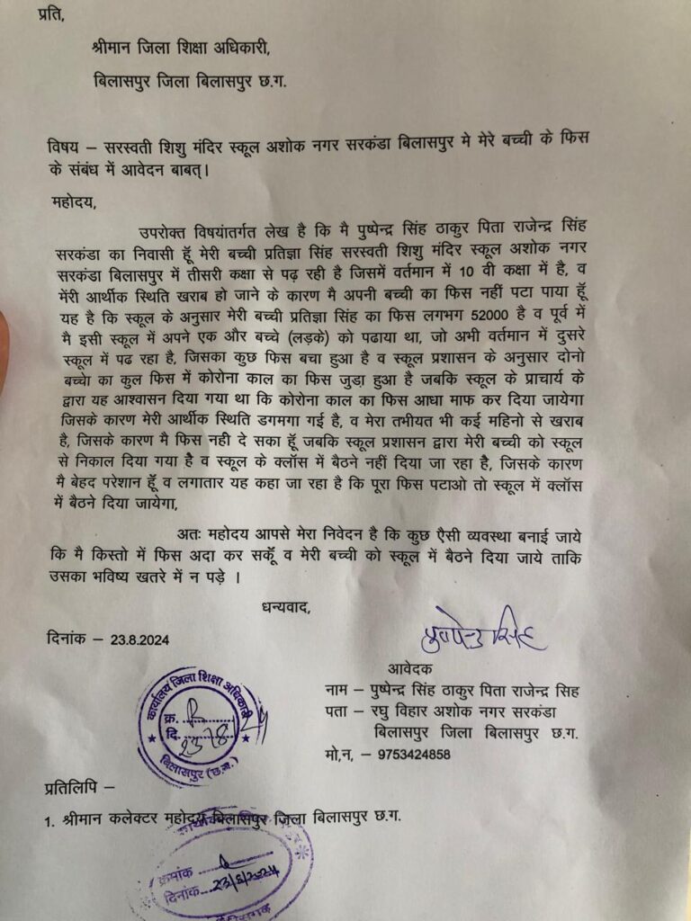 *सरस्वती शिशु मंदिर स्कूल अशोक नगर सरकंडा की हुई डीईओ से शिकायत बच्चे की फीस जमा नहीं करने पर स्कूल से बाहर का रास्ता दिखाया ,,,,*