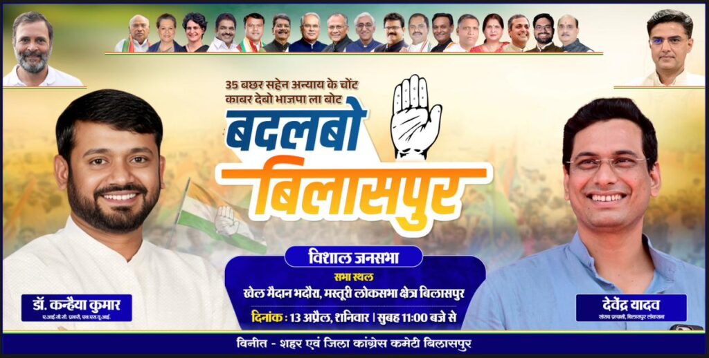 आशीष कश्यप बिलासपुर लोकसभा के चुनावी समर में दिनांक 13 अप्रैल दिन शनिवार को *देश के सुविख्यात प्रखर वक्ता एवं युवा नेता डॉ. कन्हैया कुमार जी* (एआईसीसी प्रभारी एनएसयूआई) बिलासपुर लोकसभा अंतर्गत मस्तूरी के ग्राम भदौरा में आम सभा को संबोधित करते हुए *बिलासपुर से कांग्रेस के सांसद प्रत्याशी श्री देवेंद्र यादव जी* के पक्ष में प्रचार करेंगे।
